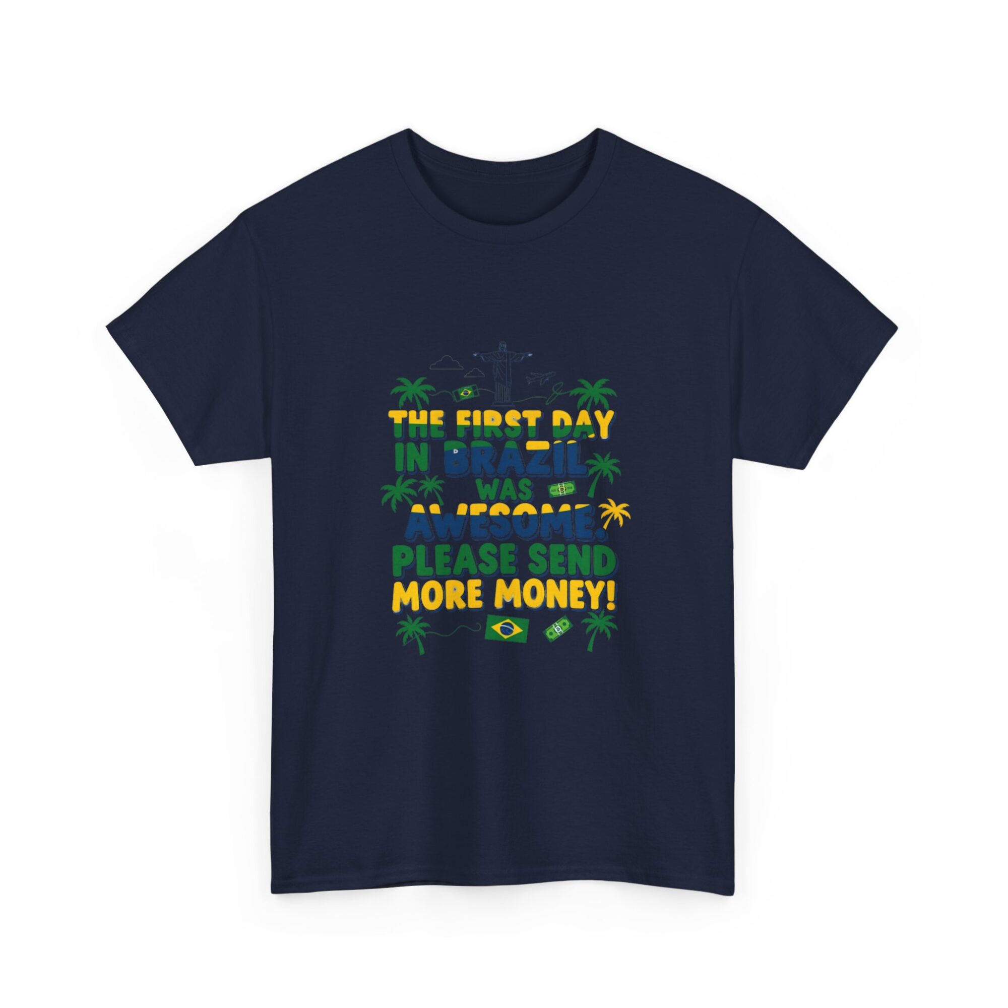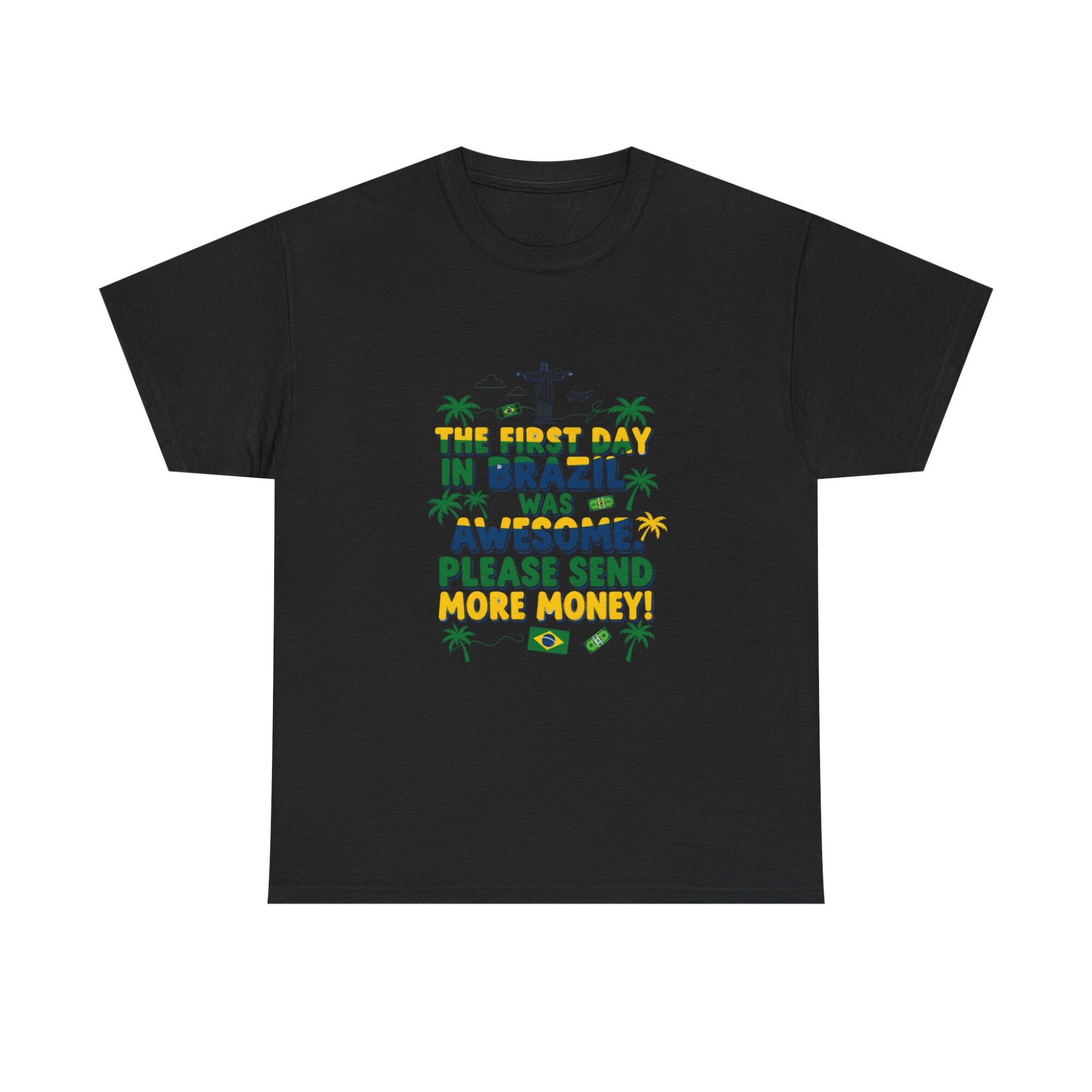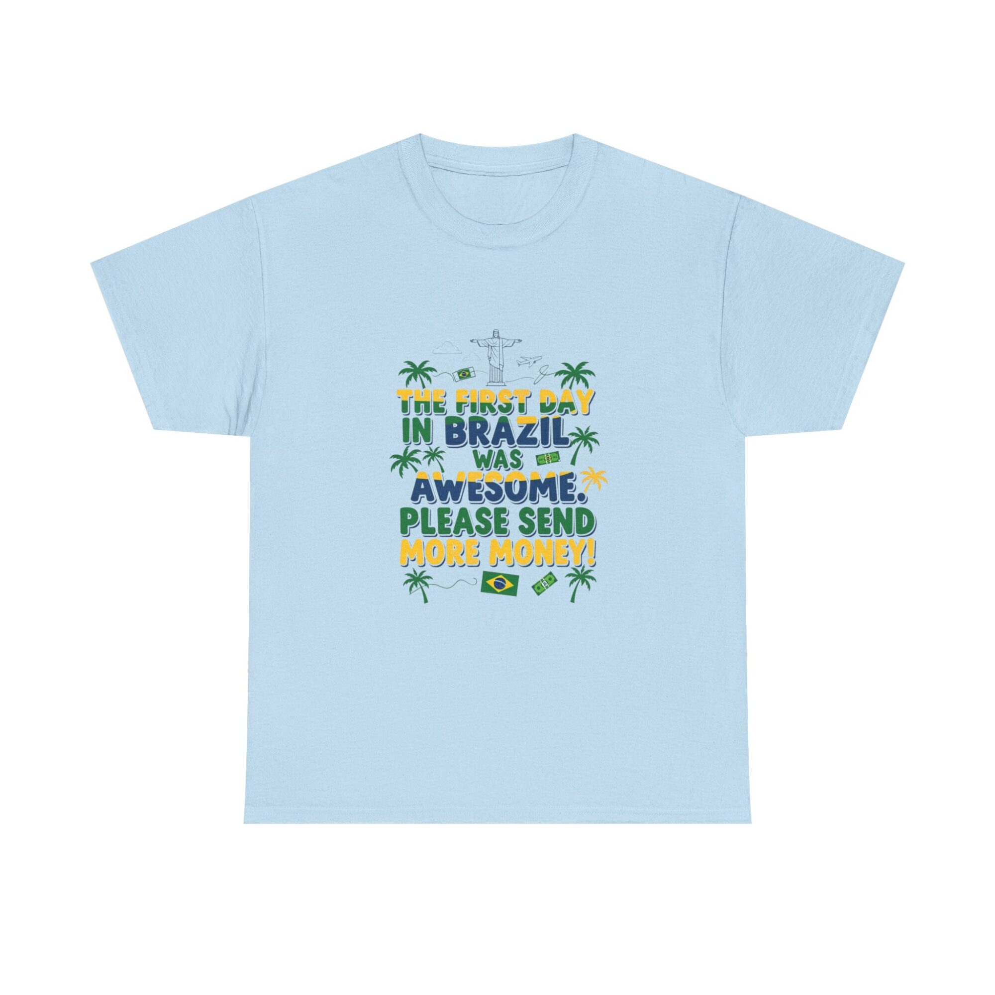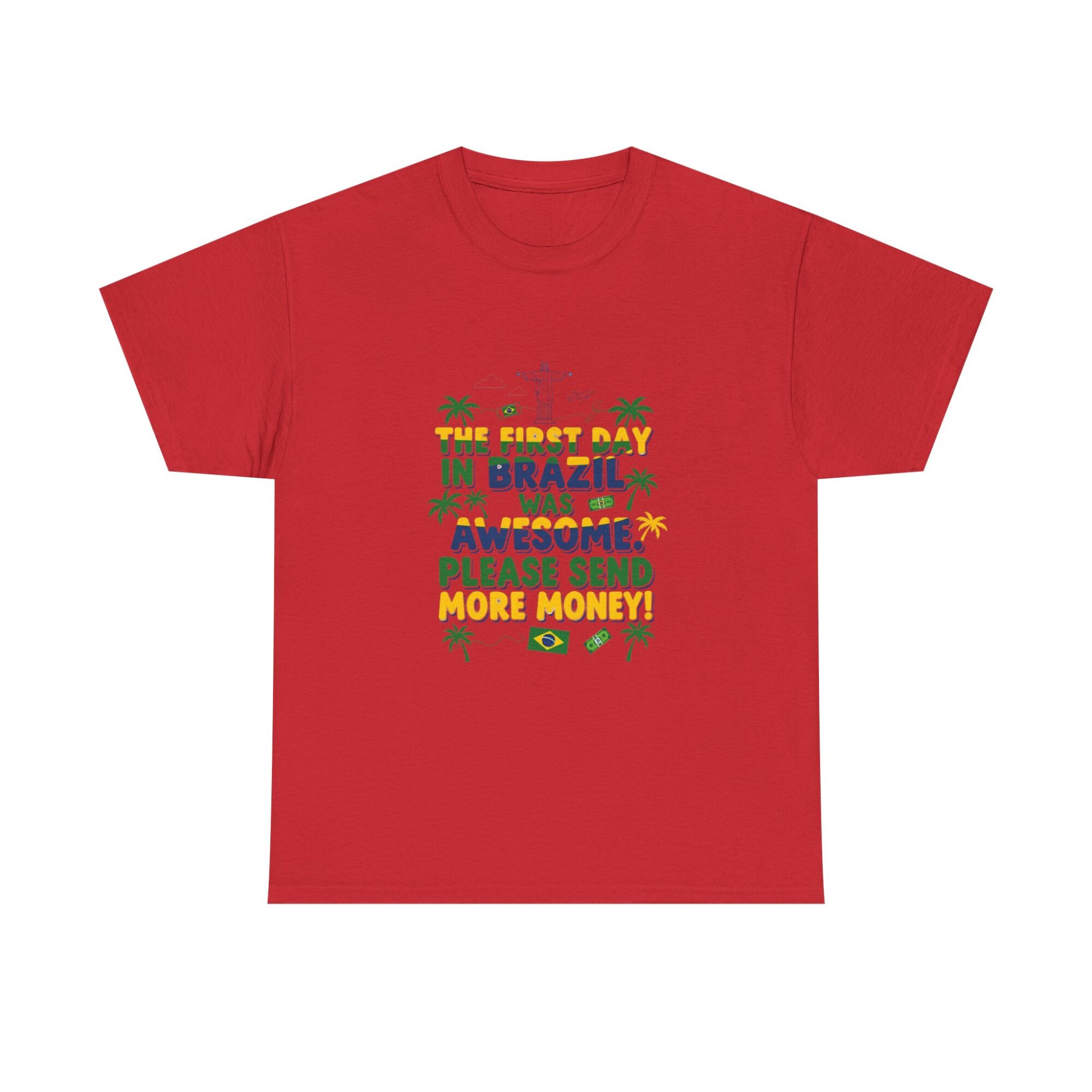 Express your love for travel with our Funny Brazil Graphic Tee! Made from soft, breathable fabric, this unisex premium t-shirt is perfect for any casual outfit. Featuring a humorous print that reads ‘The first day in Brazil was awesome. Please send more money!’, it’s ideal for gifting or making a statement. Designed for comfort and style, this shirt also features high-quality printing using Printify’s direct-to-garment technology for long-lasting wear. Get noticed while feeling great!