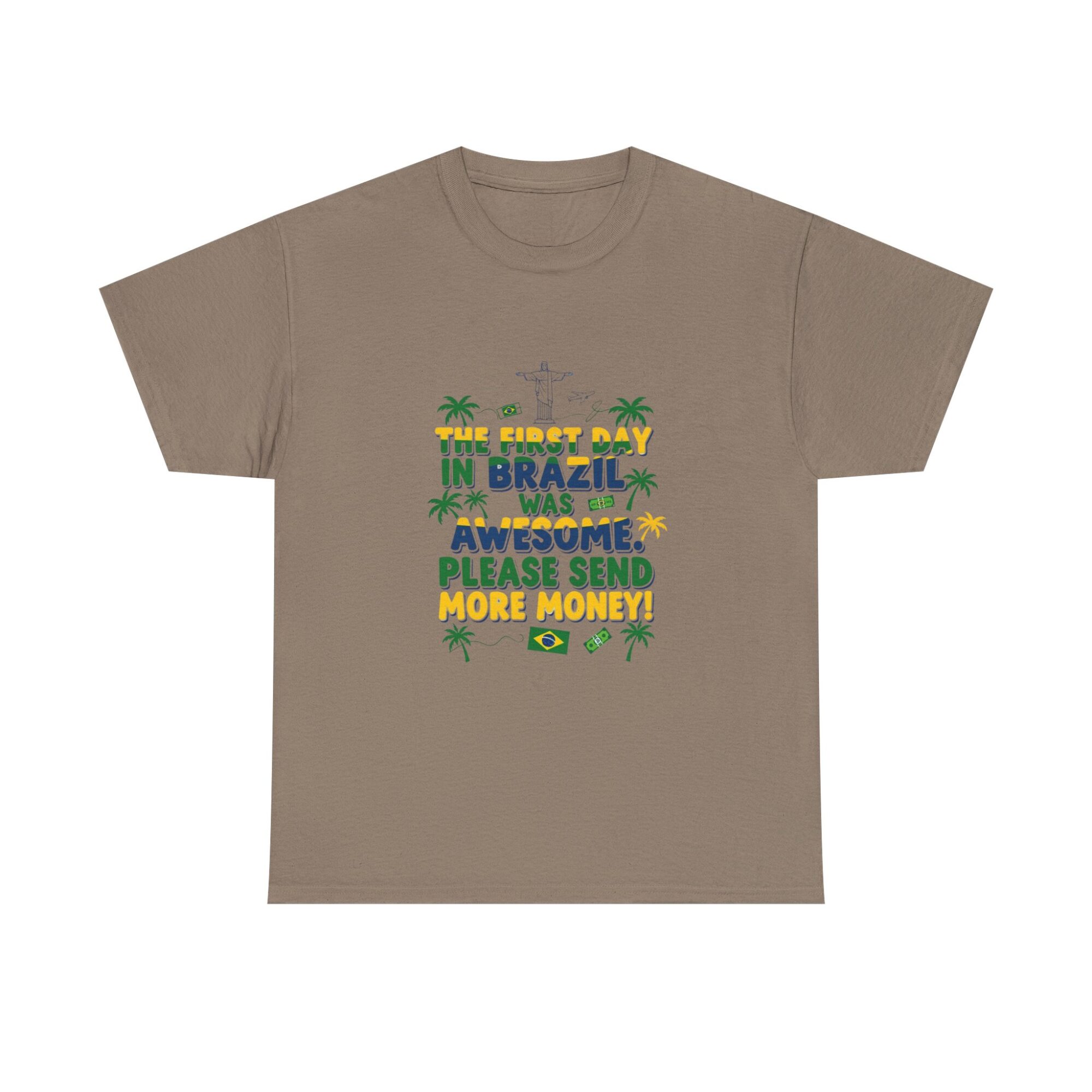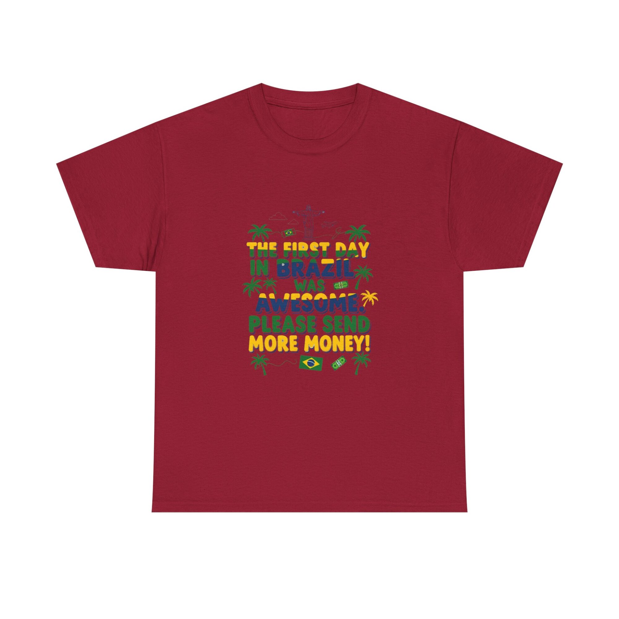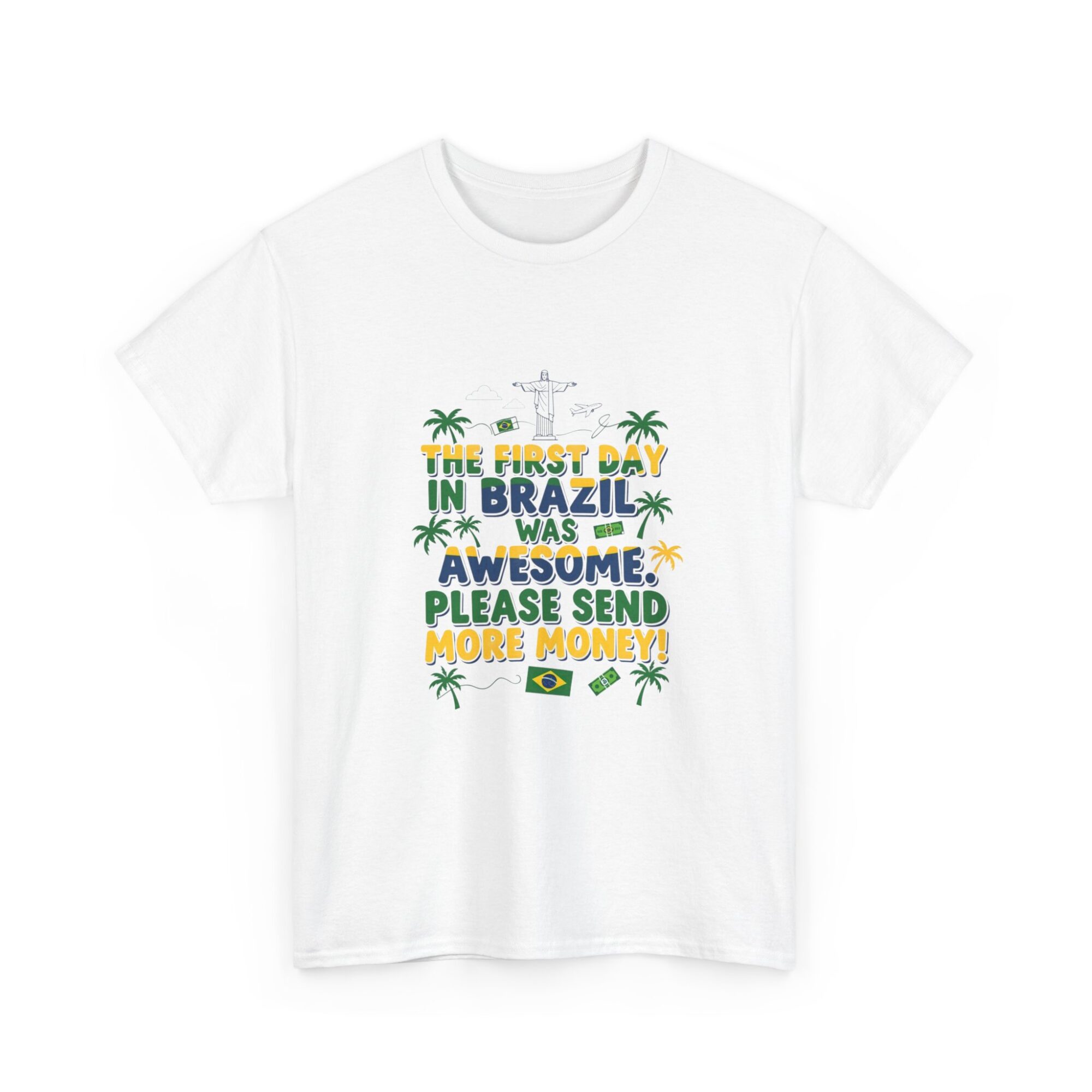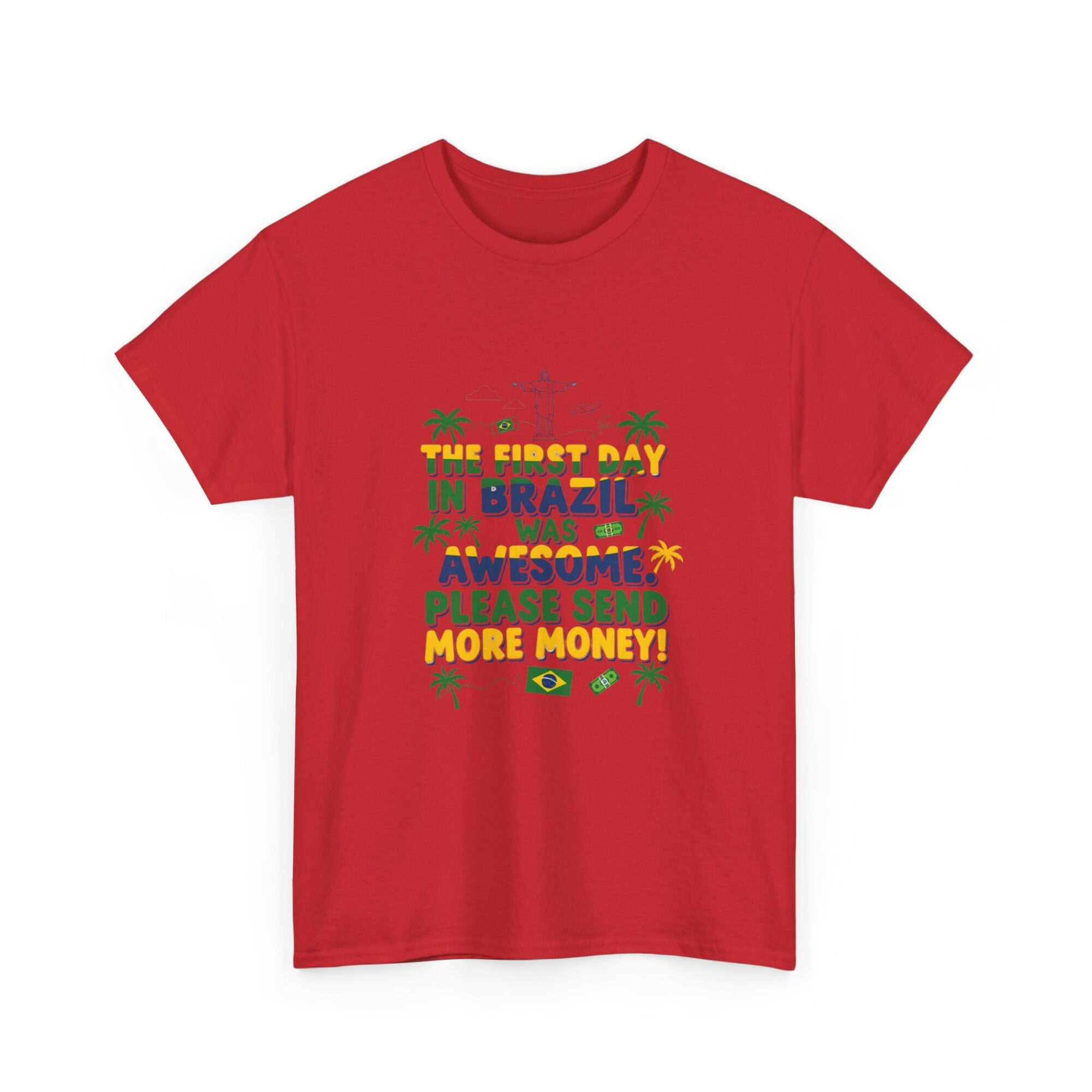 Express your love for travel with our Funny Brazil Graphic Tee! Made from soft, breathable fabric, this unisex premium t-shirt is perfect for any casual outfit. Featuring a humorous print that reads ‘The first day in Brazil was awesome. Please send more money!’, it’s ideal for gifting or making a statement. Designed for comfort and style, this shirt also features high-quality printing using Printify’s direct-to-garment technology for long-lasting wear. Get noticed while feeling great!