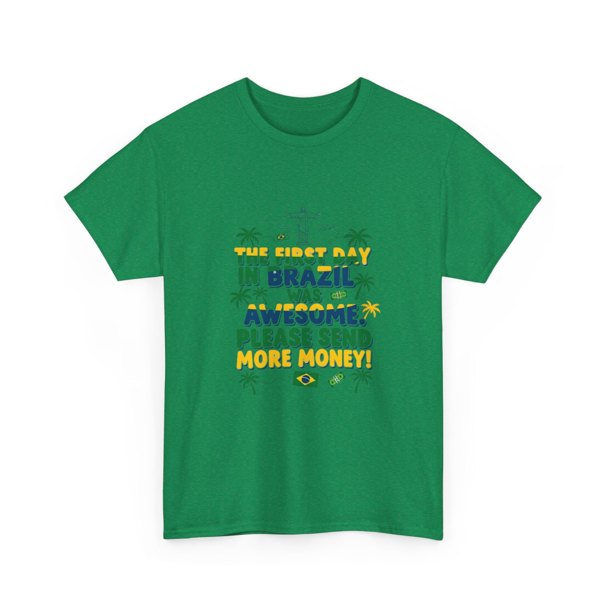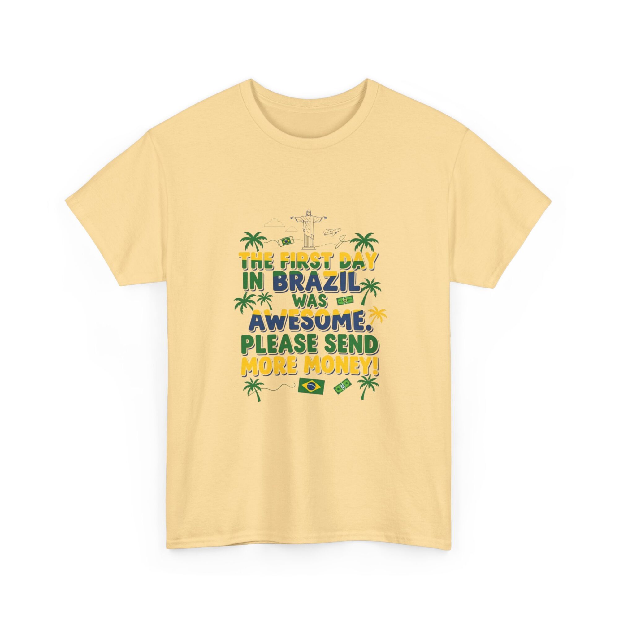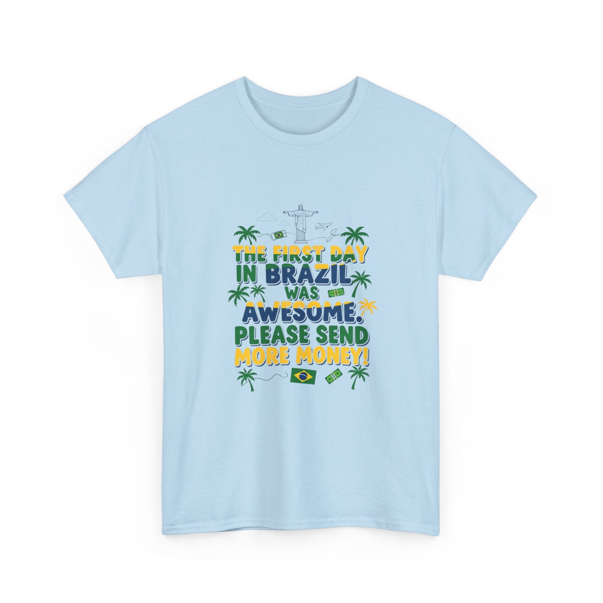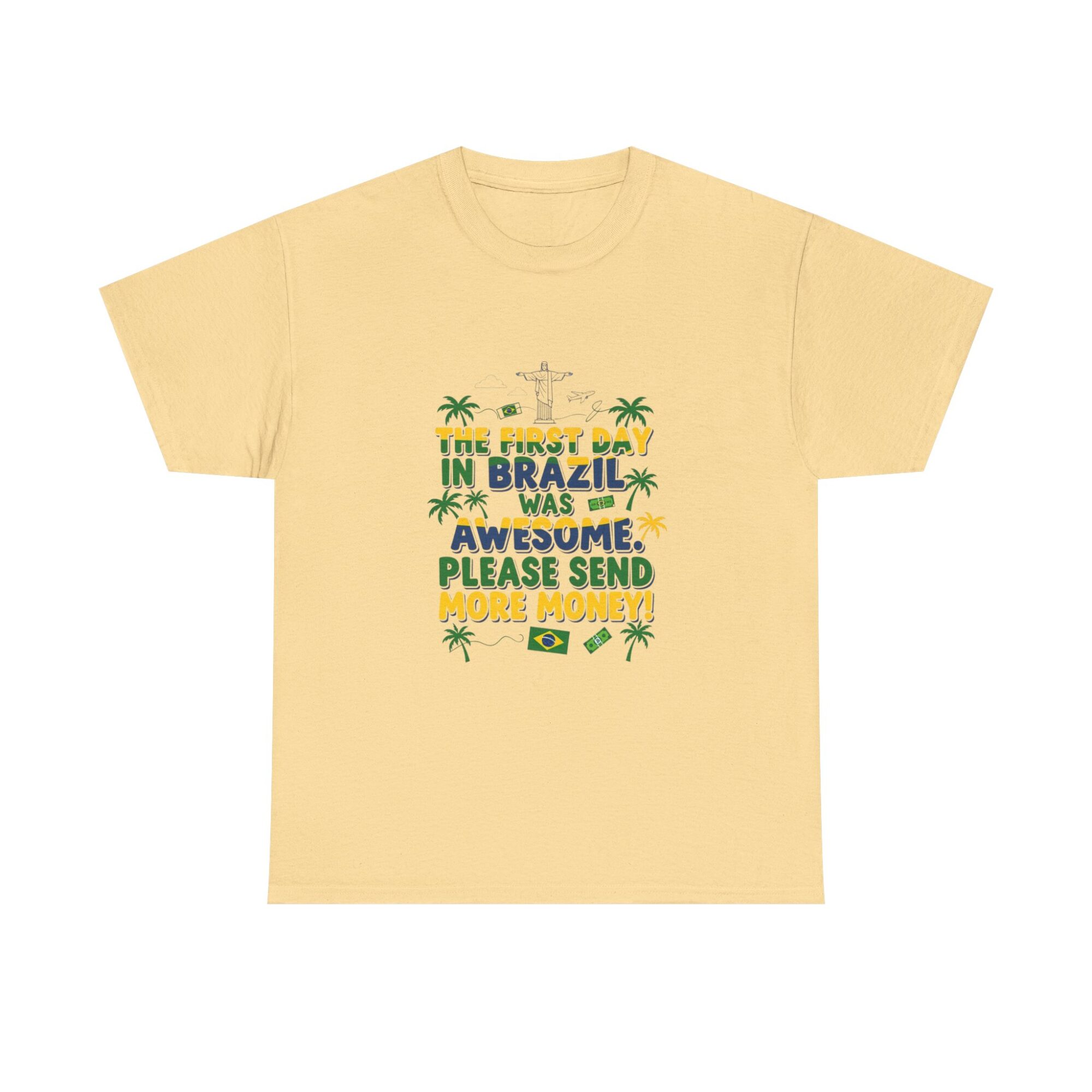Express your love for travel with our Funny Brazil Graphic Tee! Made from soft, breathable fabric, this unisex premium t-shirt is perfect for any casual outfit. Featuring a humorous print that reads ‘The first day in Brazil was awesome. Please send more money!’, it’s ideal for gifting or making a statement. Designed for comfort and style, this shirt also features high-quality printing using Printify’s direct-to-garment technology for long-lasting wear. Get noticed while feeling great!