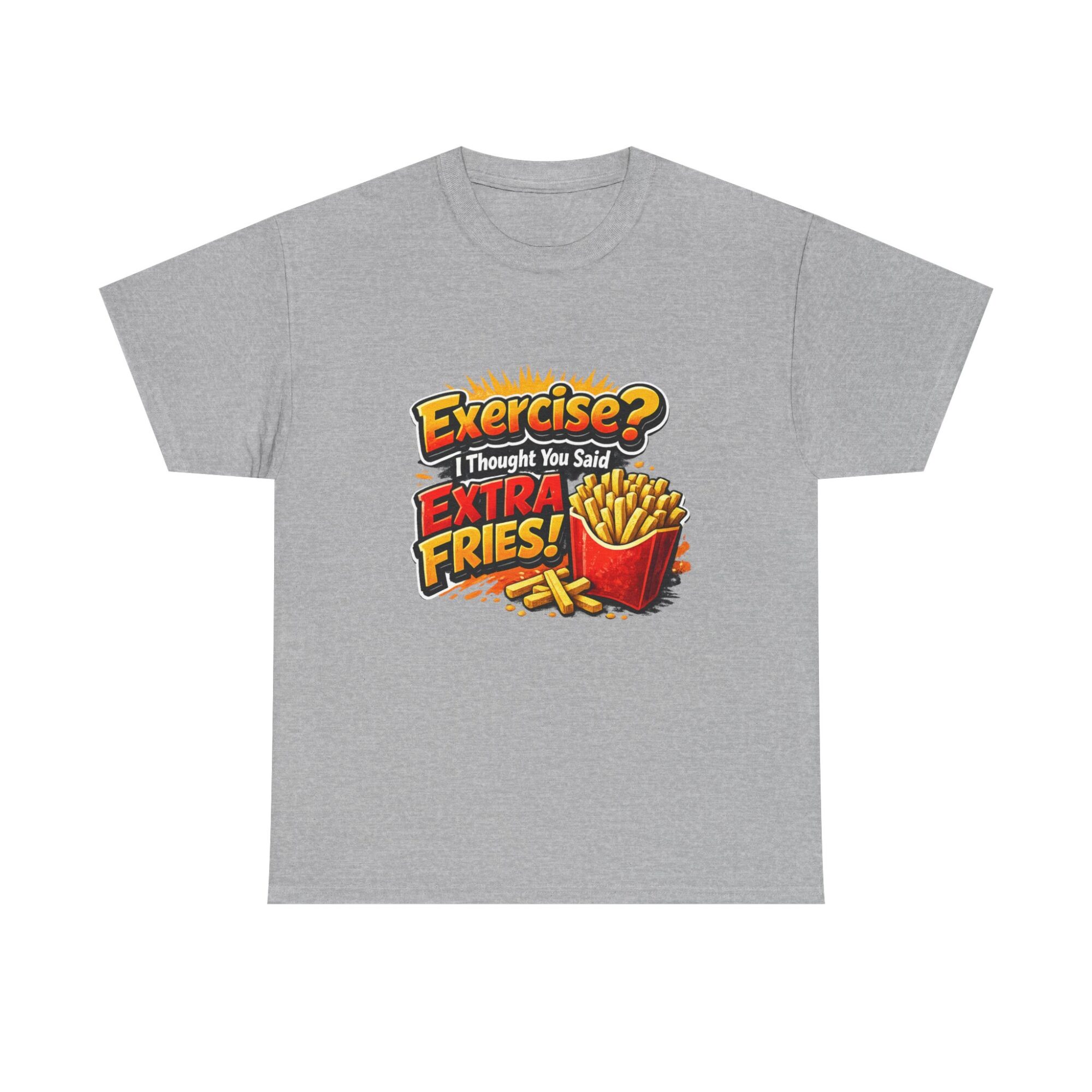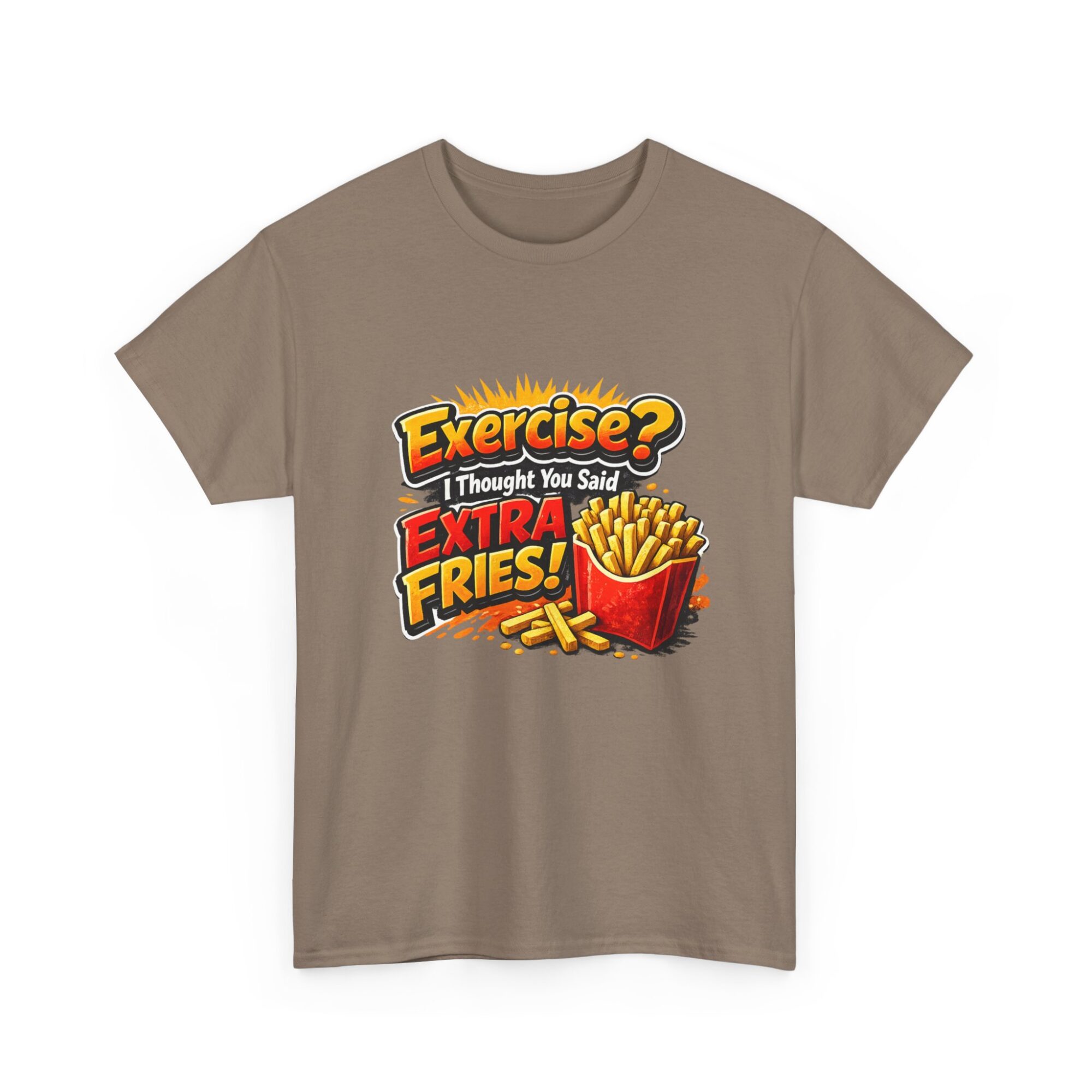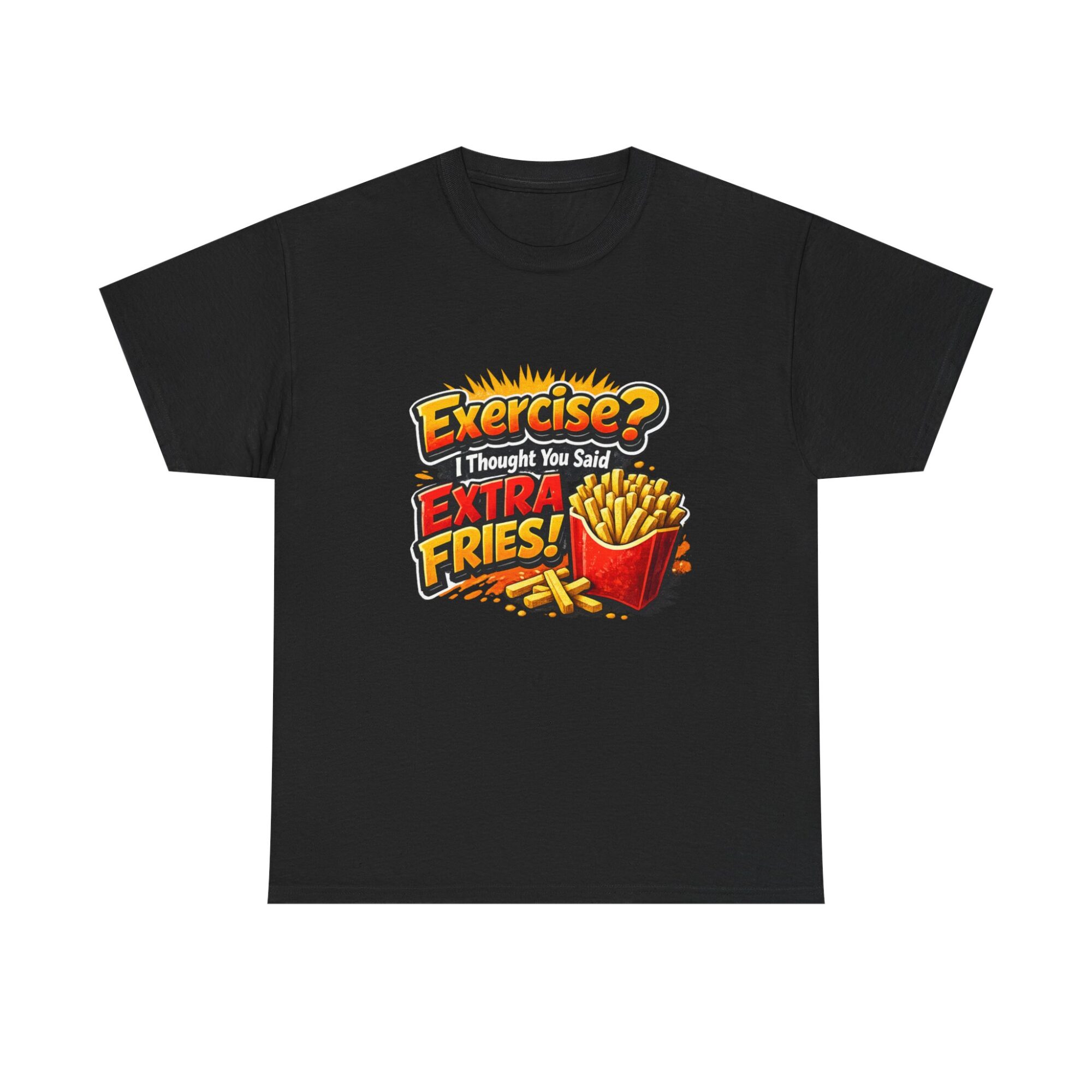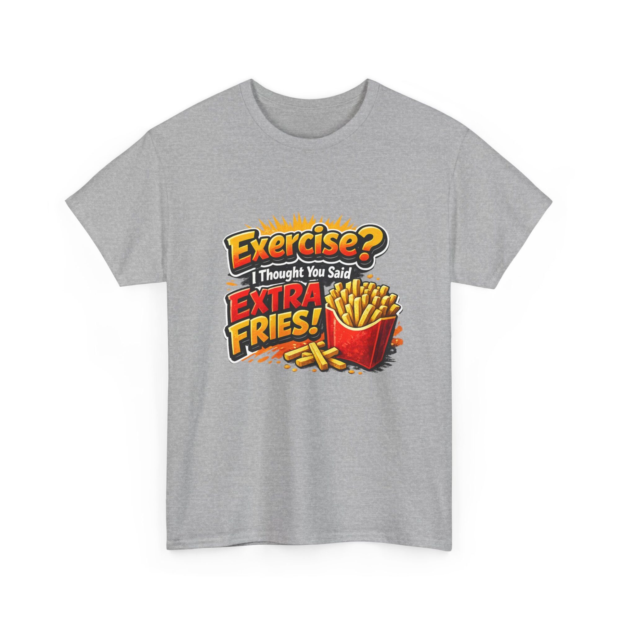 Elevate your casual wardrobe with our funny ‘Exercise? I Thought You Said Extra Fries!’ graphic tee. Made from soft, breathable fabric, this unisex t-shirt combines humor and comfort, making it ideal for everyday wear or gifting. Printed using high-quality techniques for long-lasting vibrancy, it’s a perfect addition to any trendsetter’s collection. Show off your personality effortlessly!