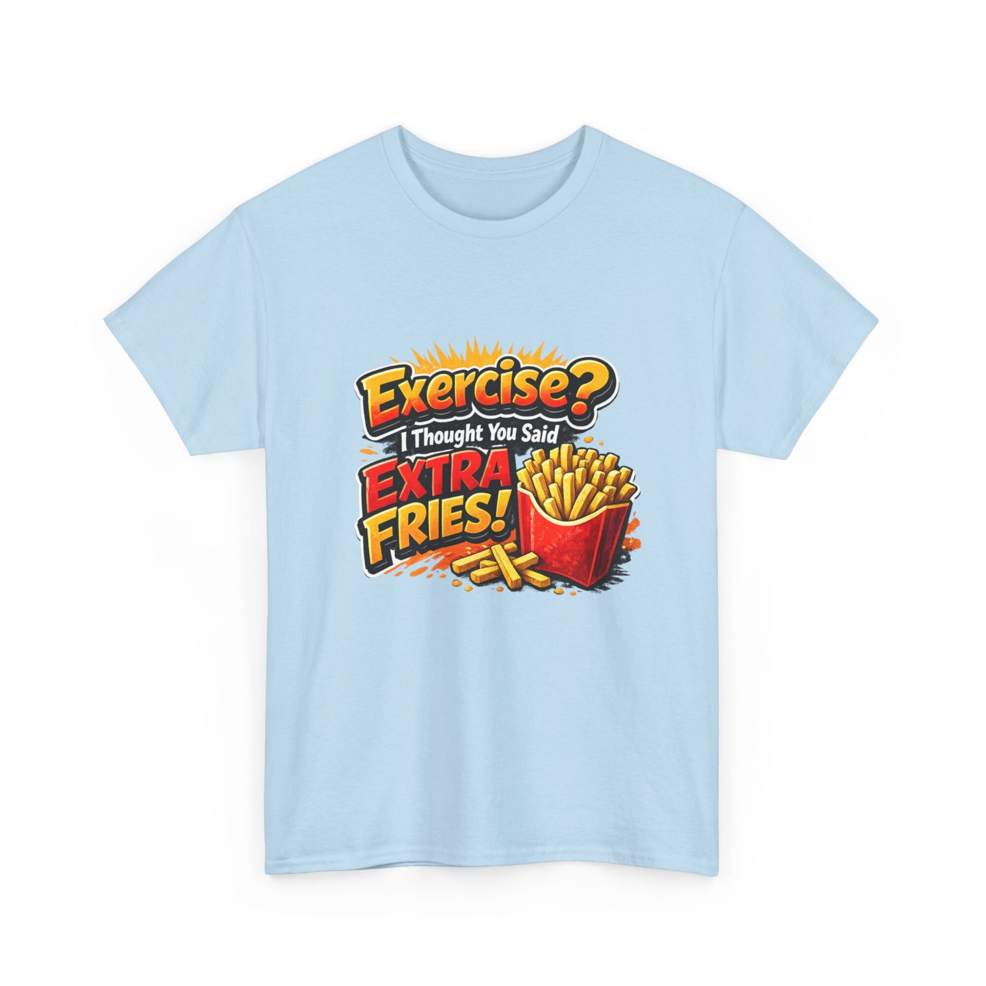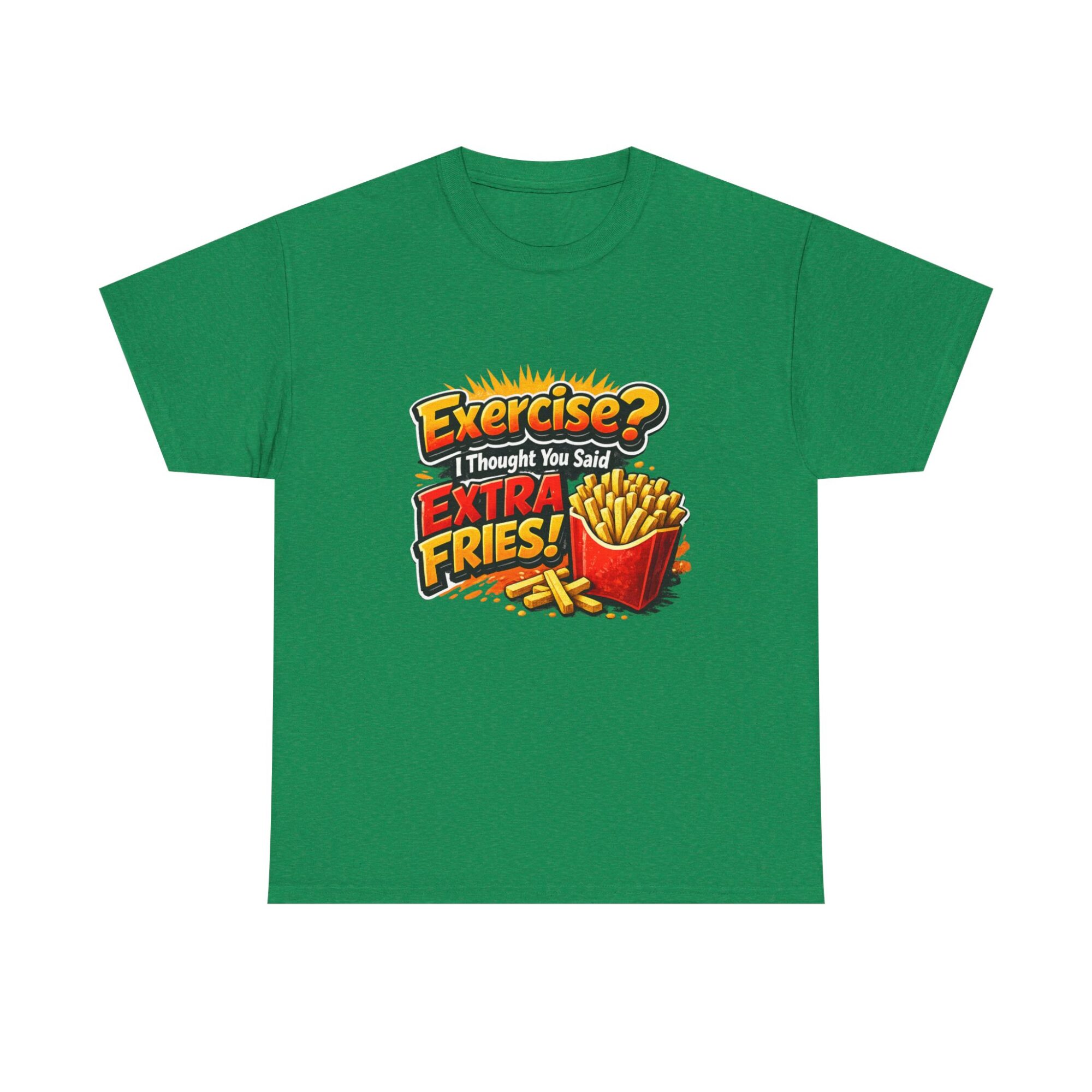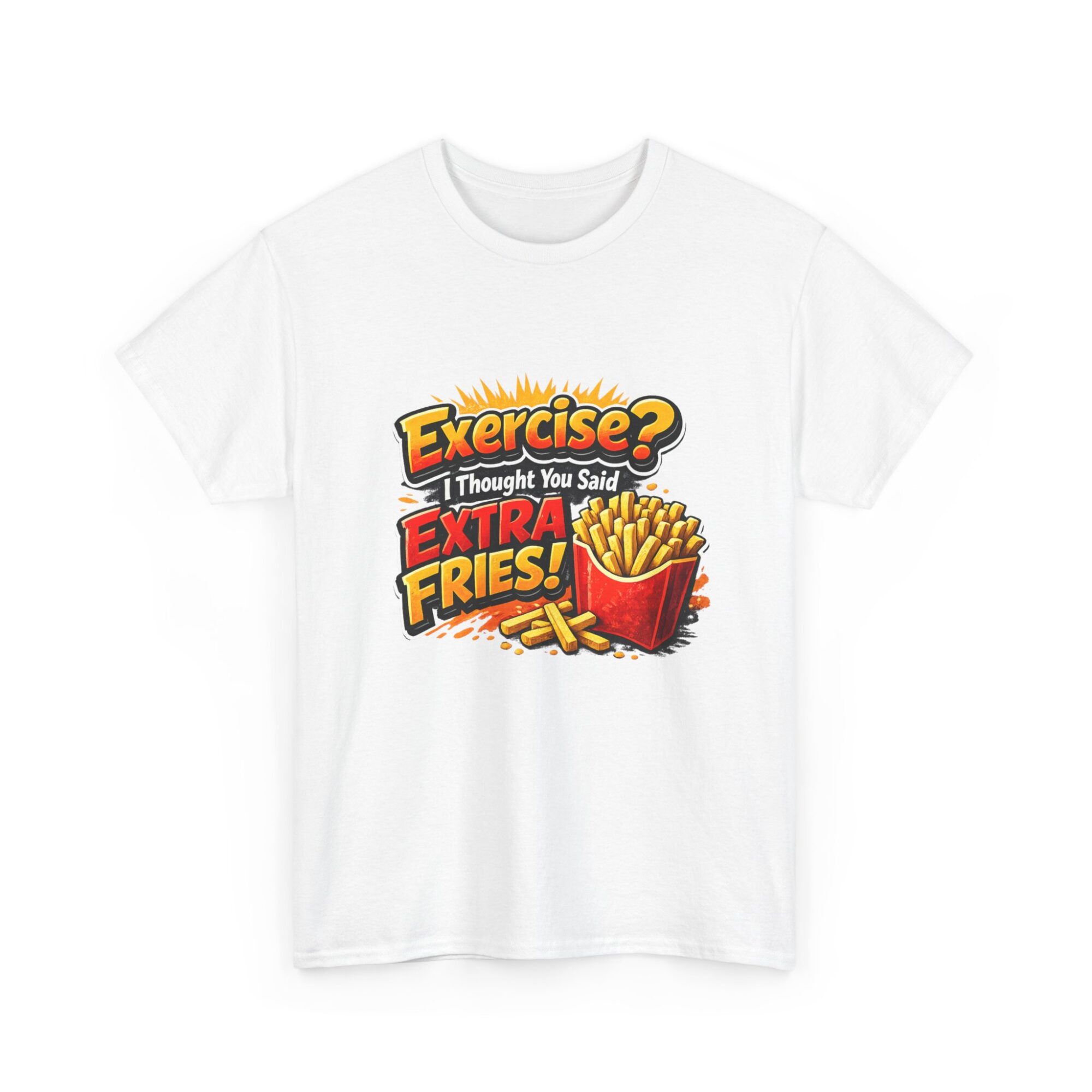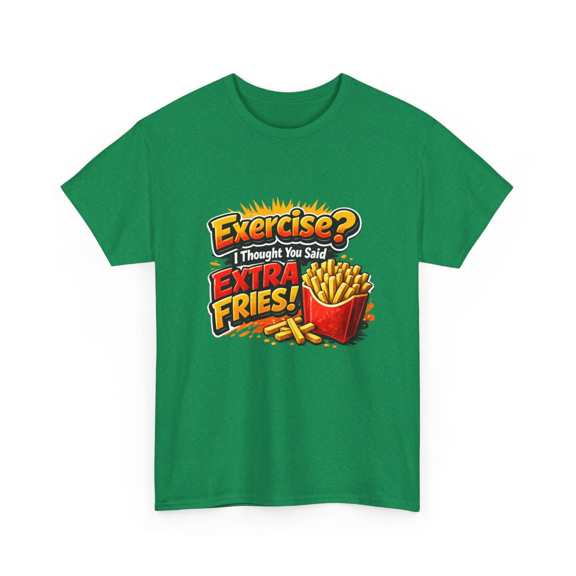Elevate your casual wardrobe with our funny ‘Exercise? I Thought You Said Extra Fries!’ graphic tee. Made from soft, breathable fabric, this unisex t-shirt combines humor and comfort, making it ideal for everyday wear or gifting. Printed using high-quality techniques for long-lasting vibrancy, it’s a perfect addition to any trendsetter’s collection. Show off your personality effortlessly!