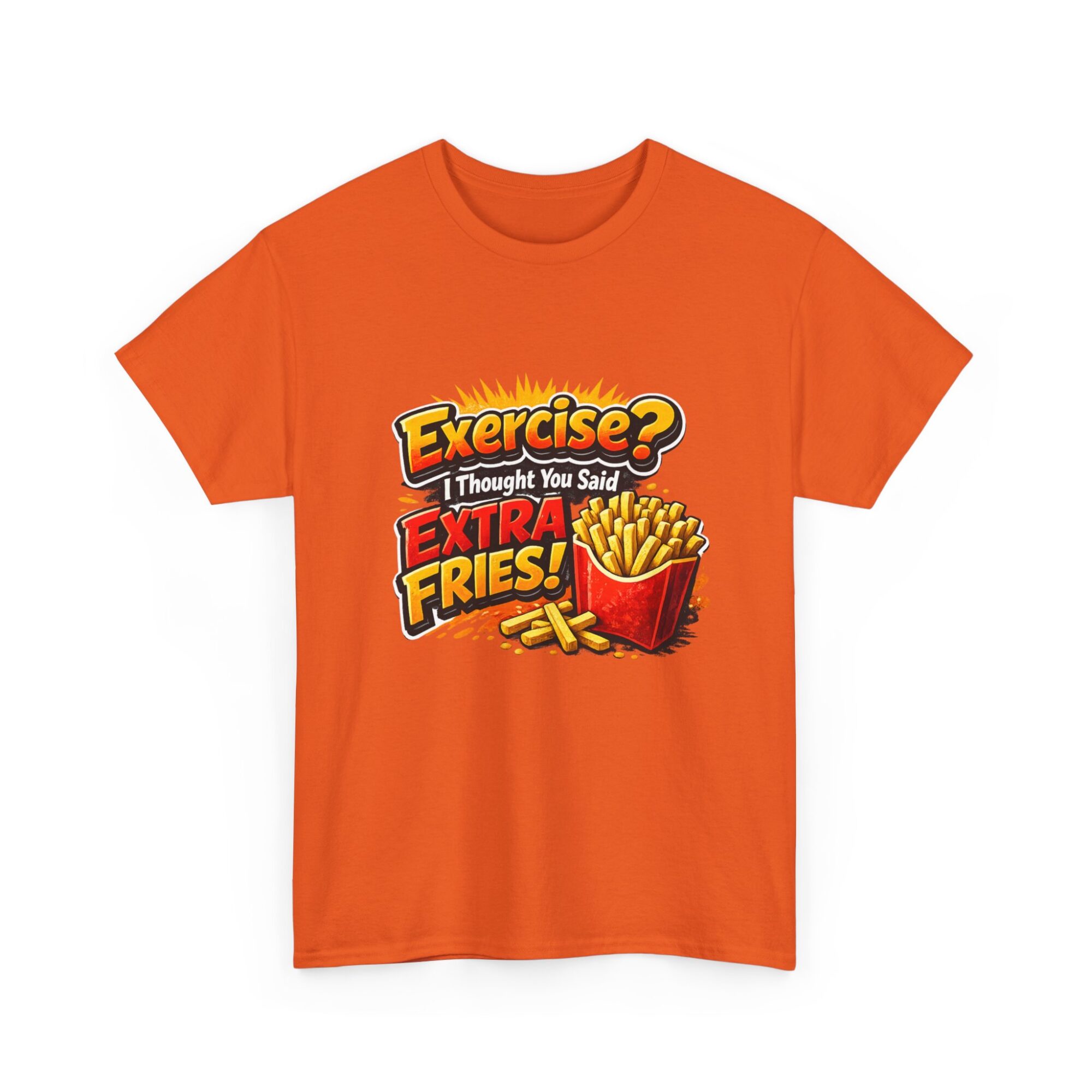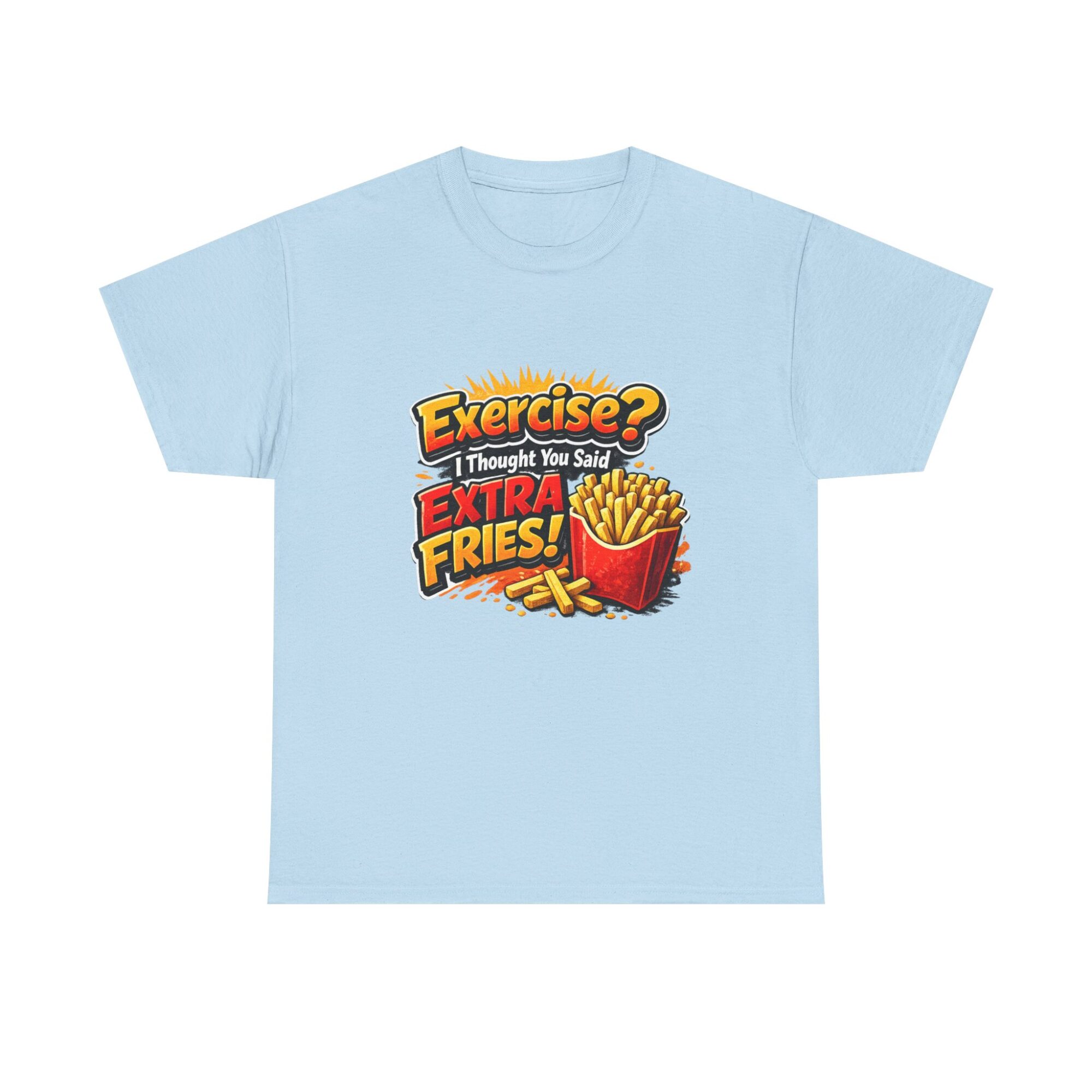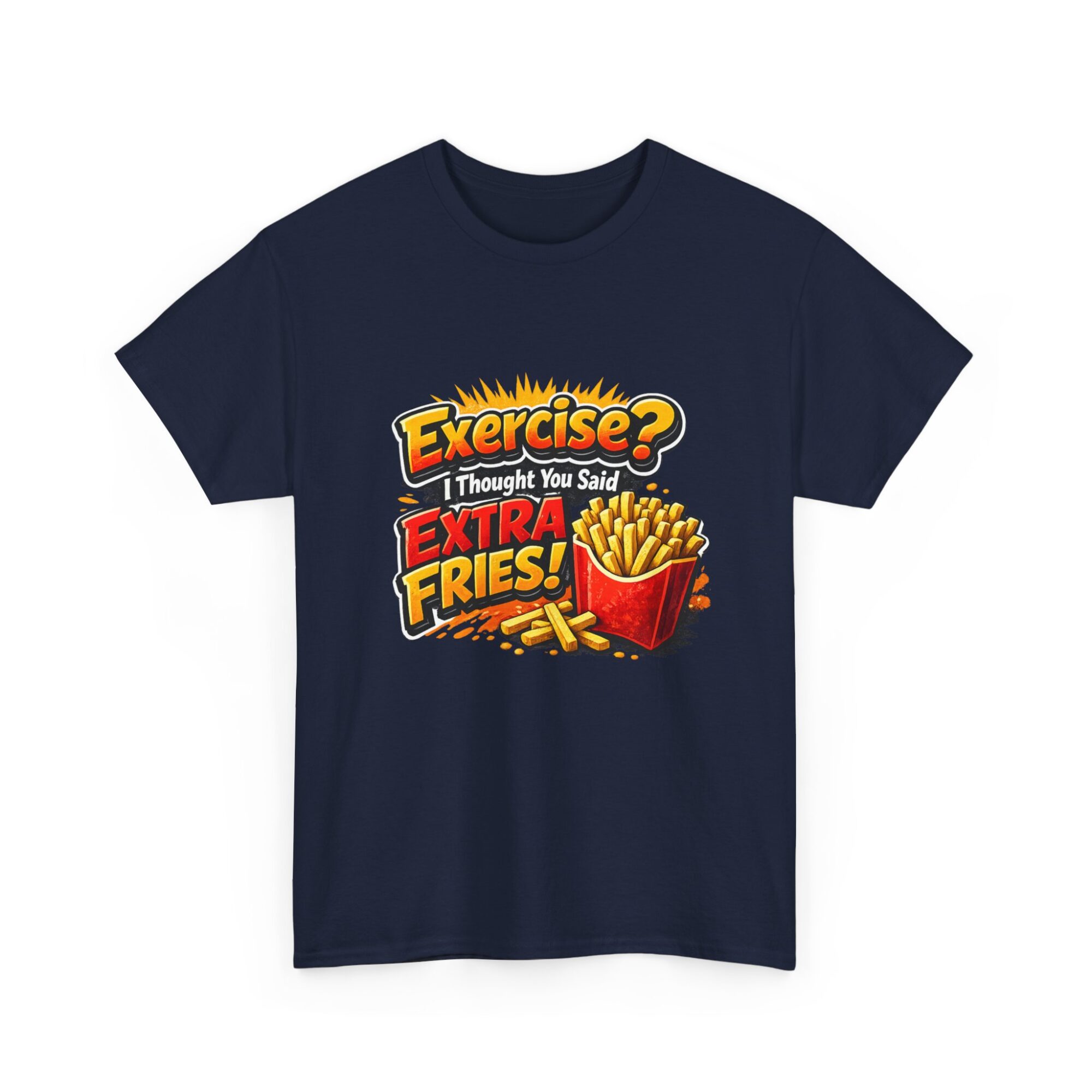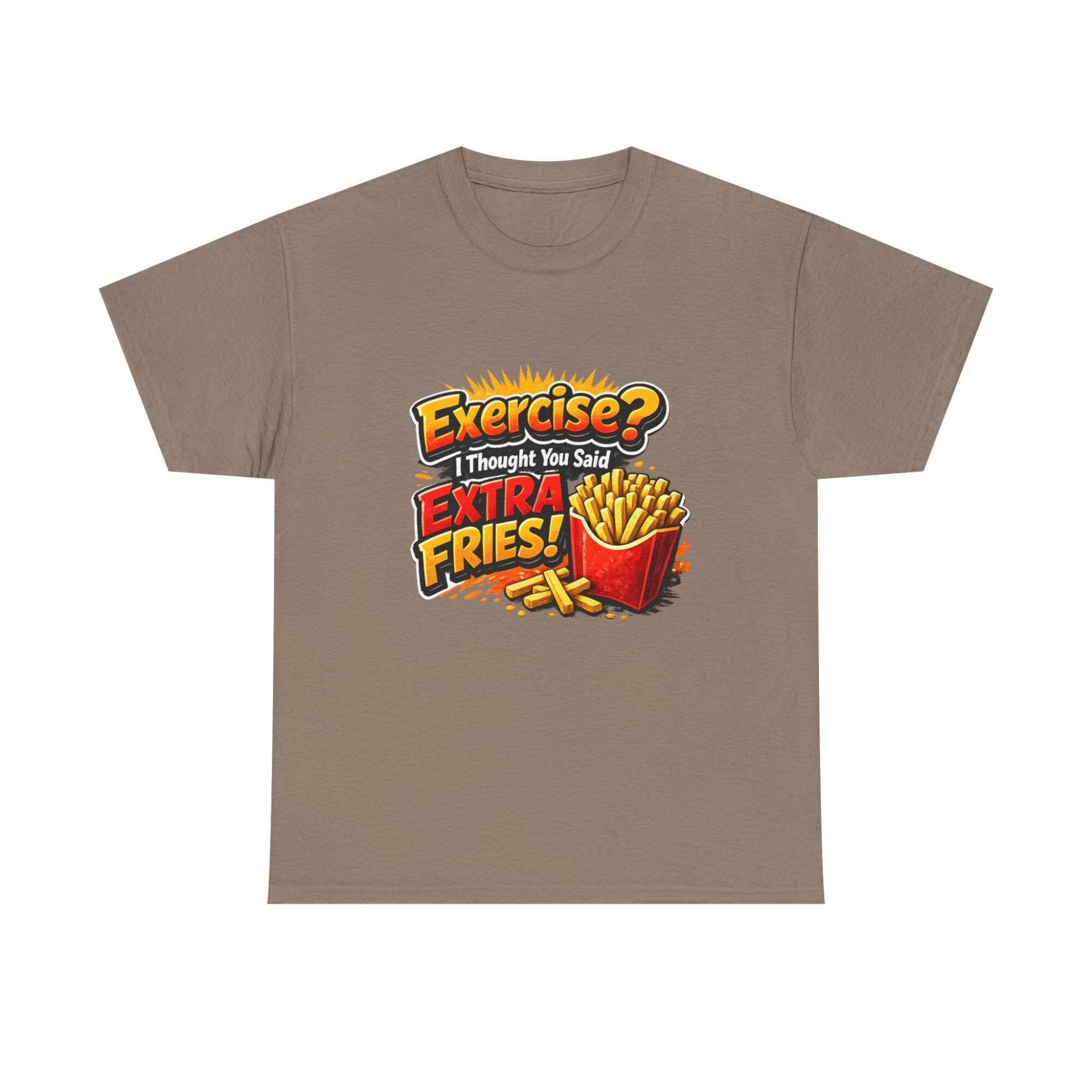 Elevate your casual wardrobe with our funny ‘Exercise? I Thought You Said Extra Fries!’ graphic tee. Made from soft, breathable fabric, this unisex t-shirt combines humor and comfort, making it ideal for everyday wear or gifting. Printed using high-quality techniques for long-lasting vibrancy, it’s a perfect addition to any trendsetter’s collection. Show off your personality effortlessly!