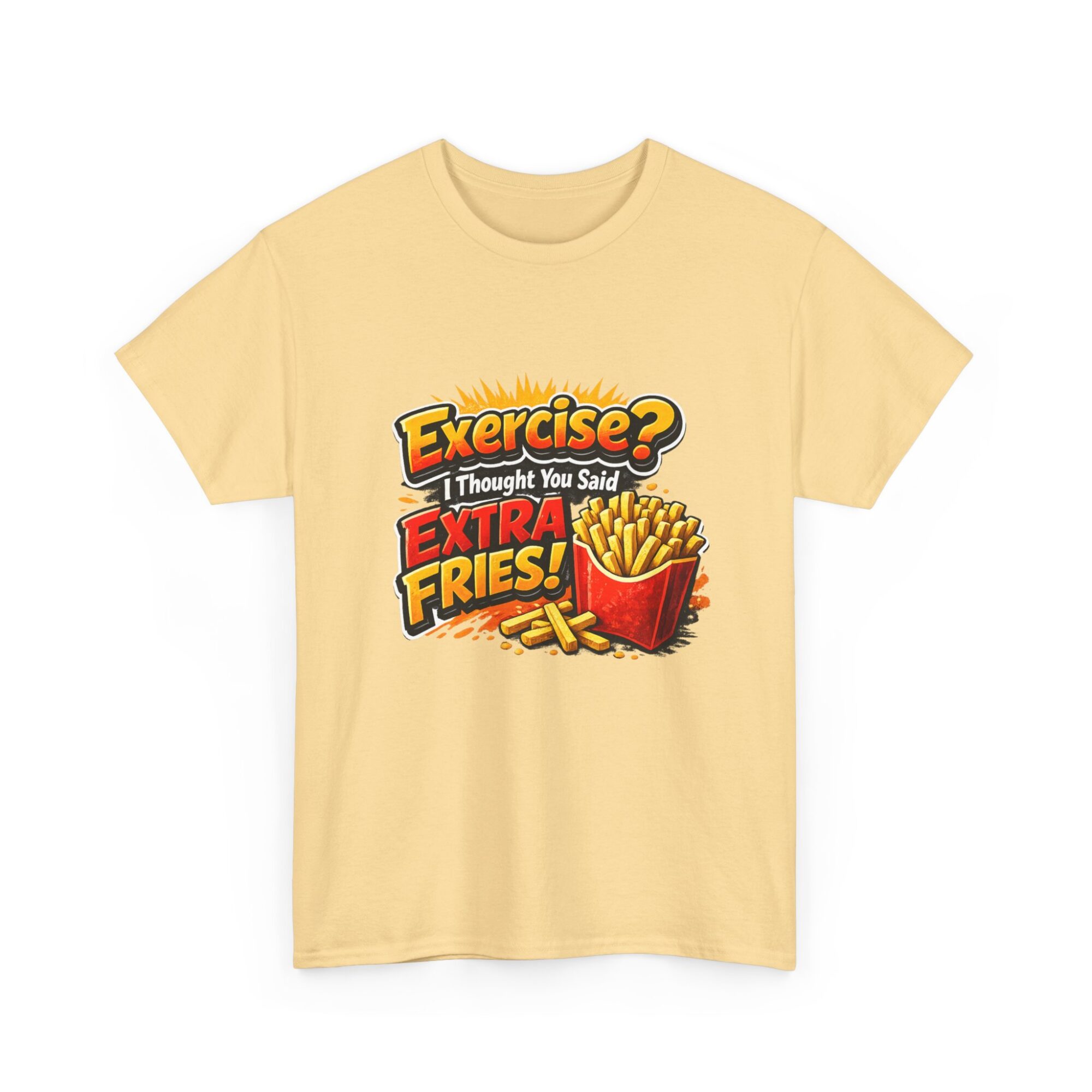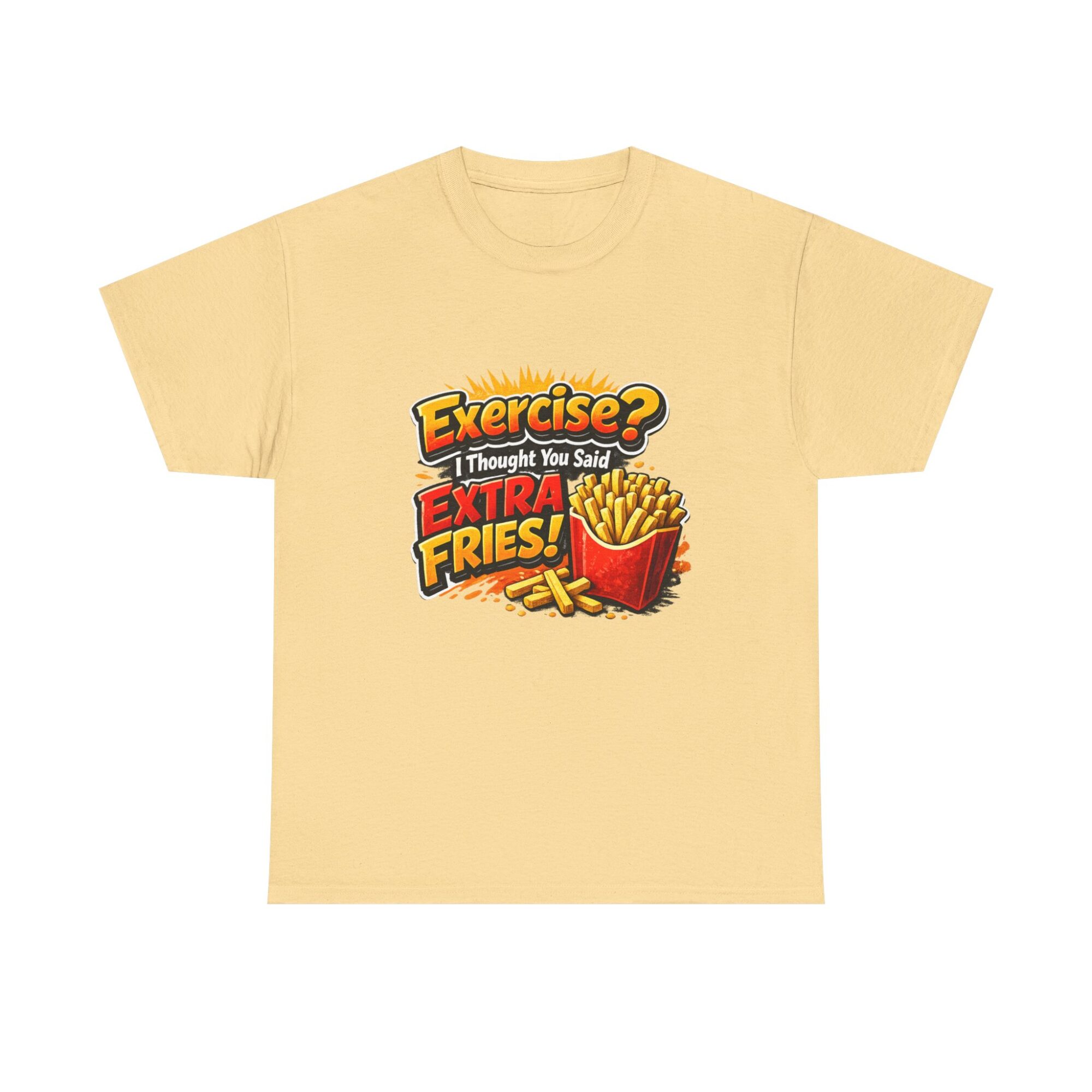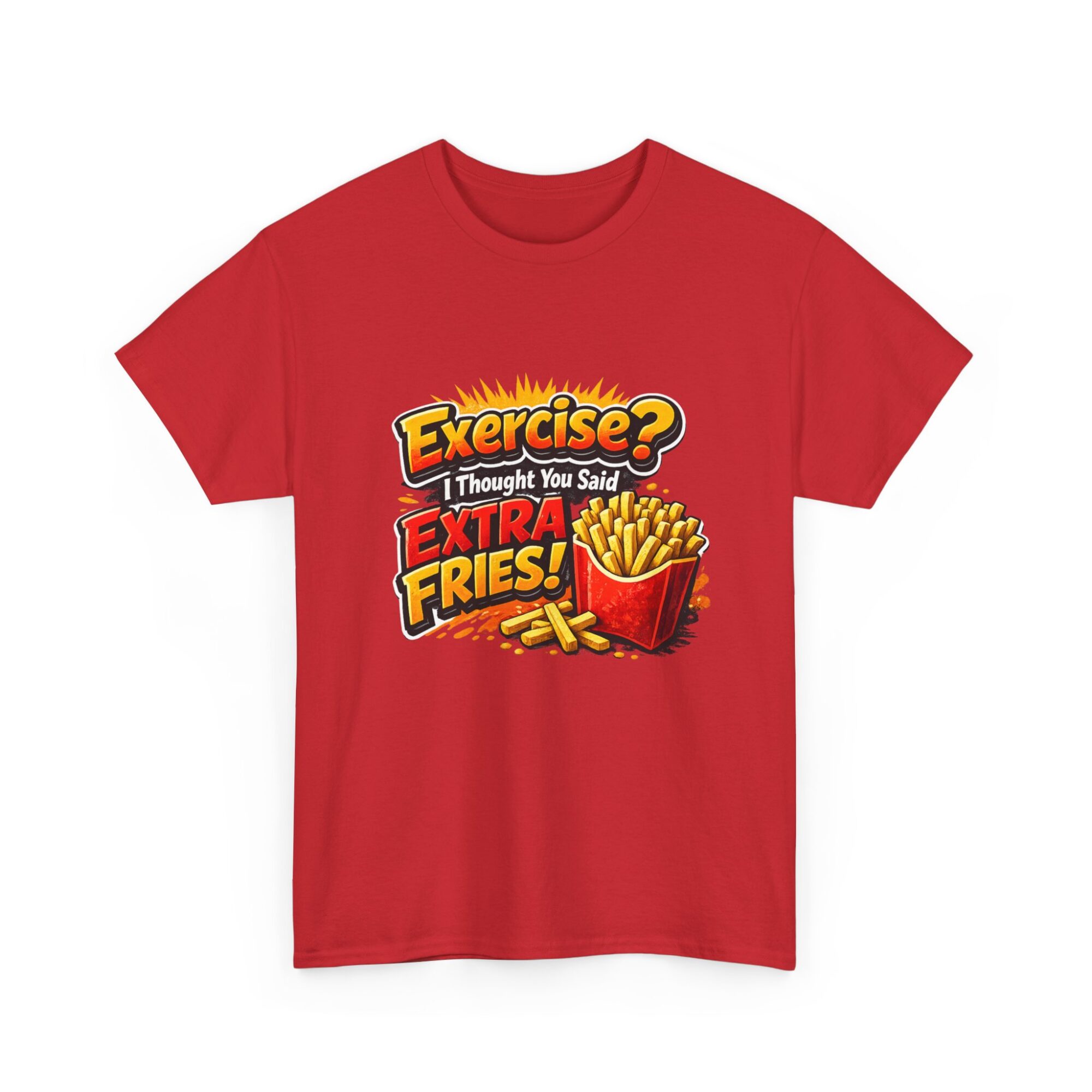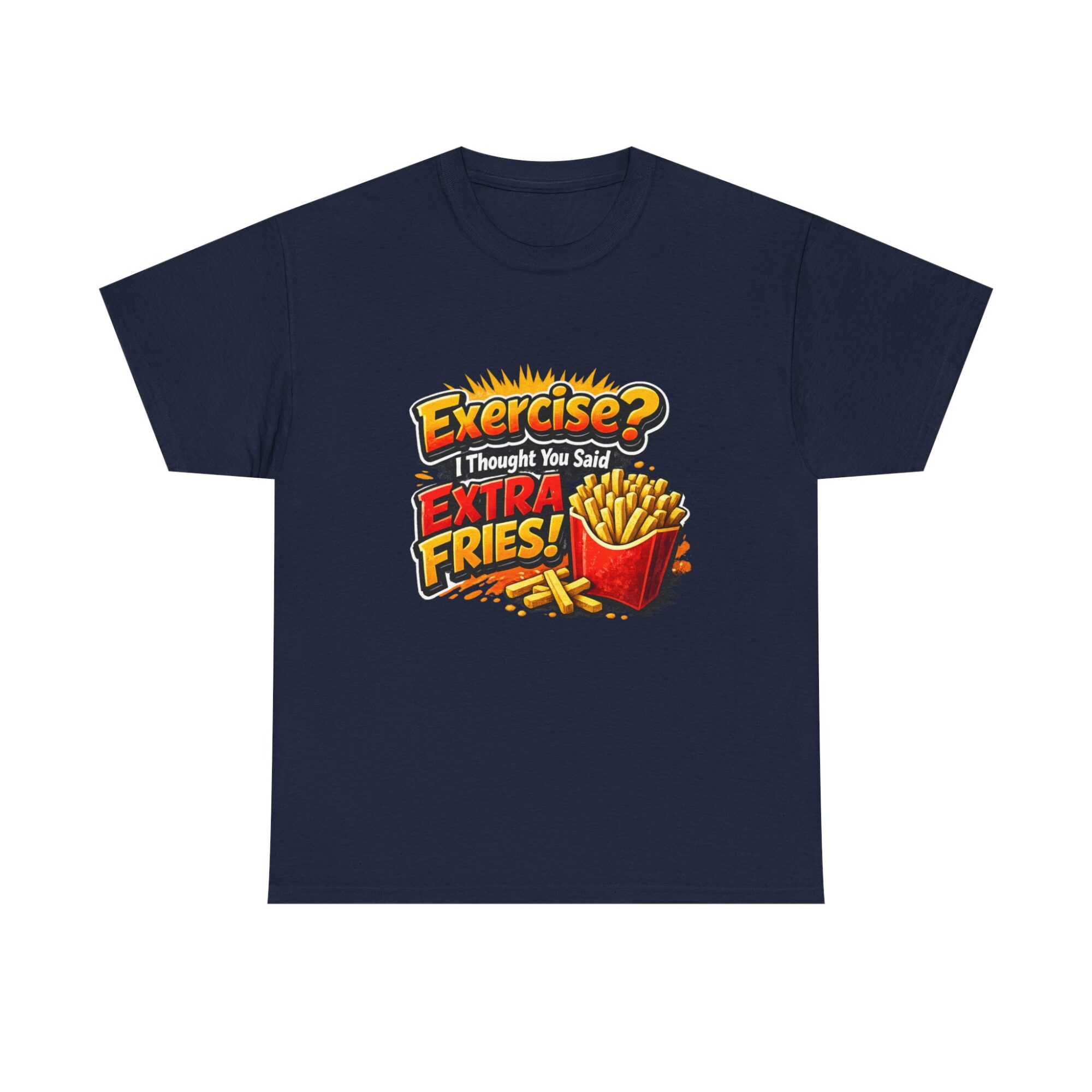 Elevate your casual wardrobe with our funny ‘Exercise? I Thought You Said Extra Fries!’ graphic tee. Made from soft, breathable fabric, this unisex t-shirt combines humor and comfort, making it ideal for everyday wear or gifting. Printed using high-quality techniques for long-lasting vibrancy, it’s a perfect addition to any trendsetter’s collection. Show off your personality effortlessly!