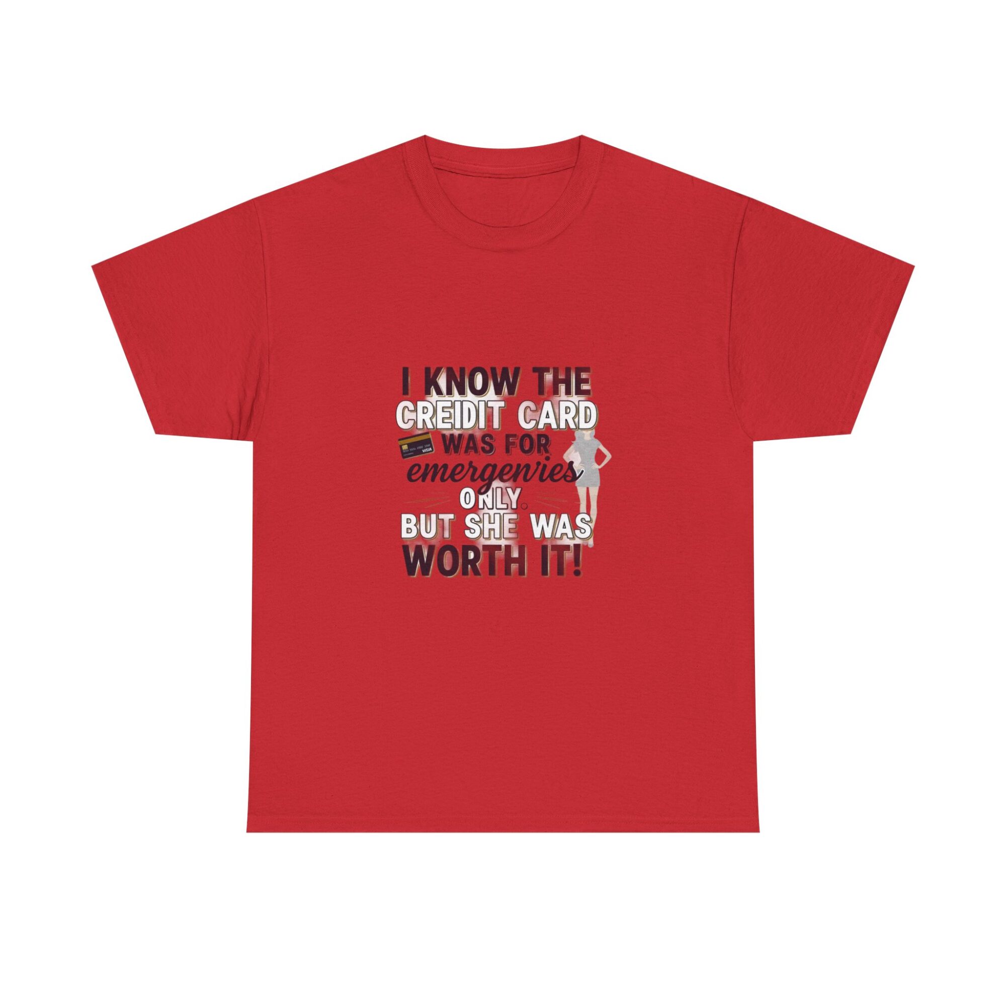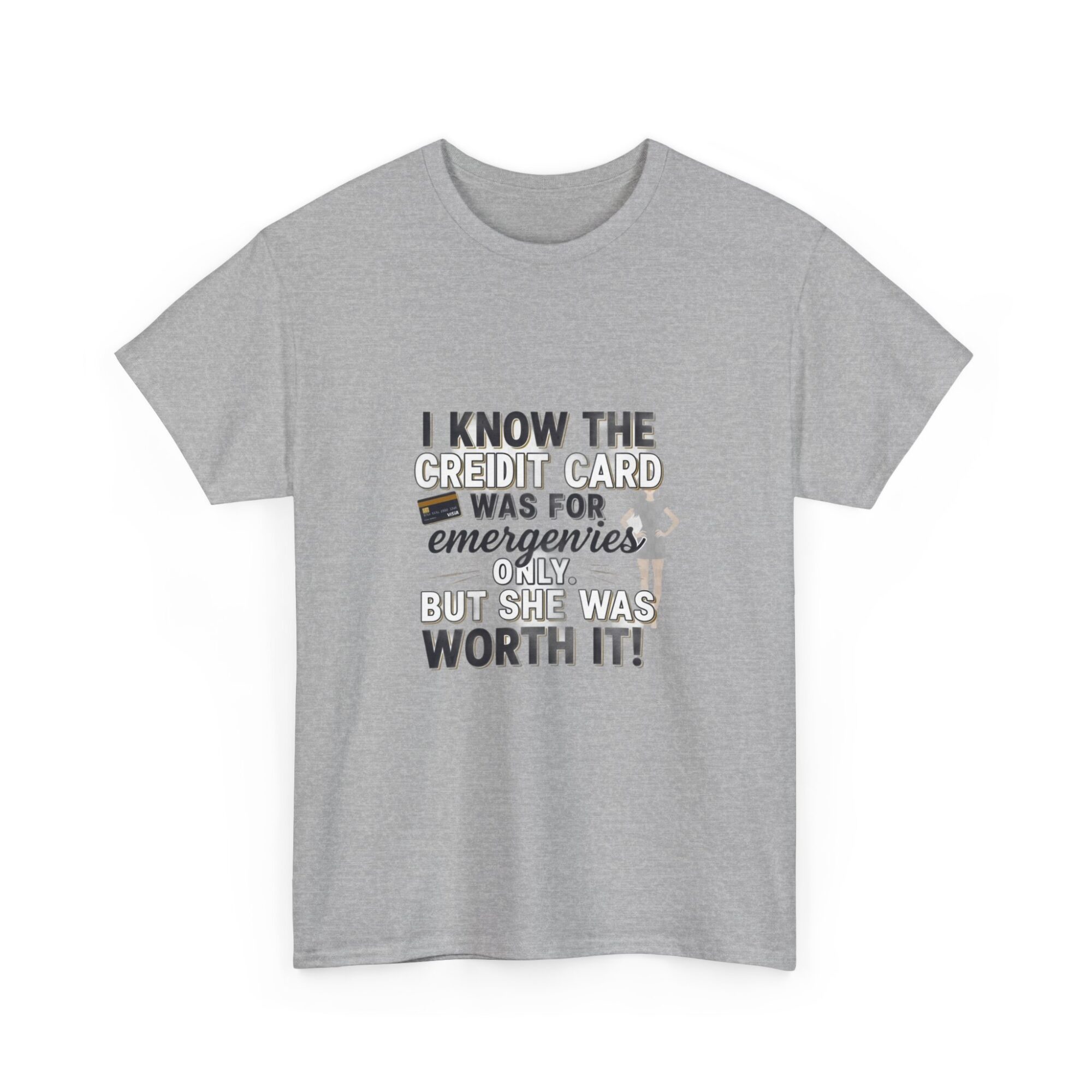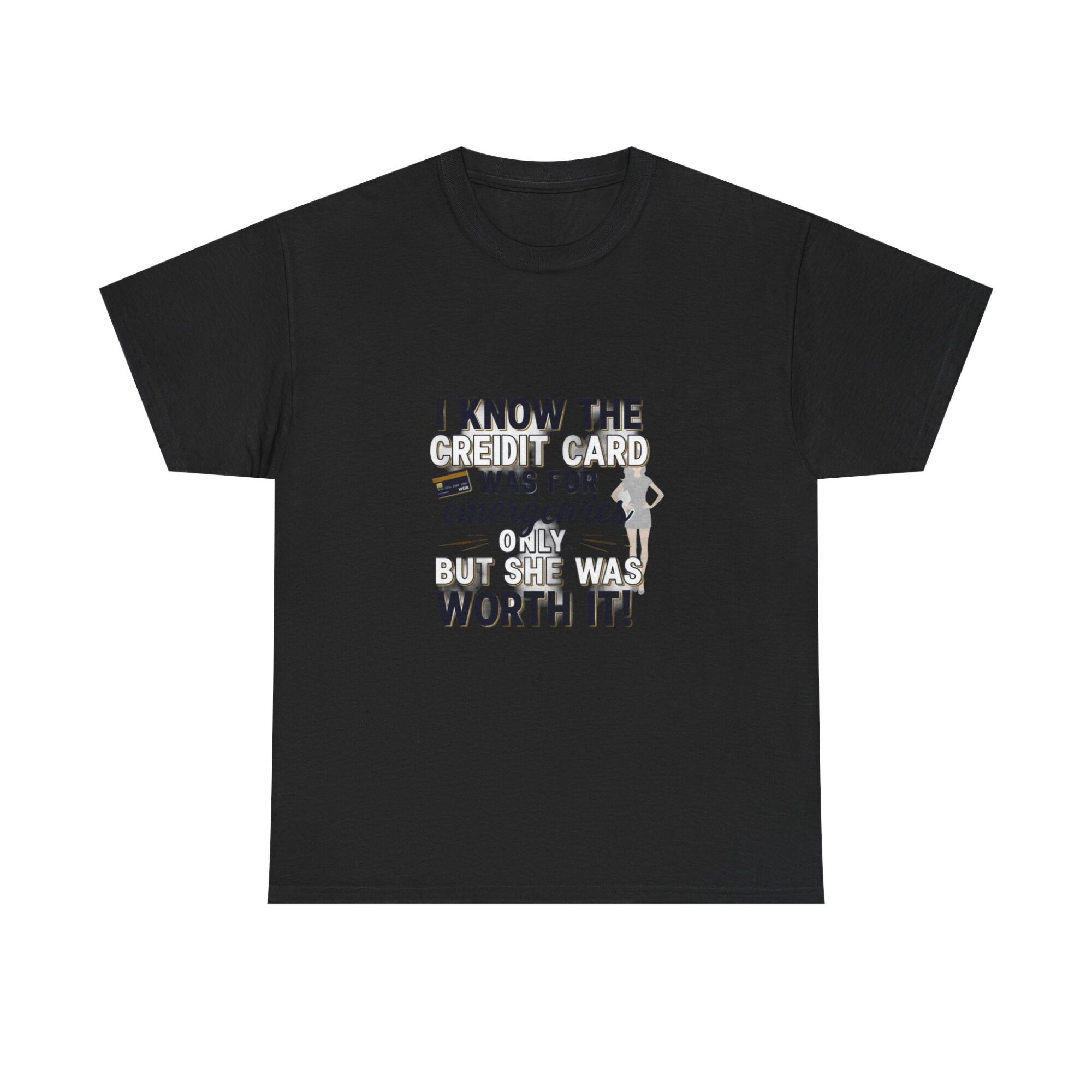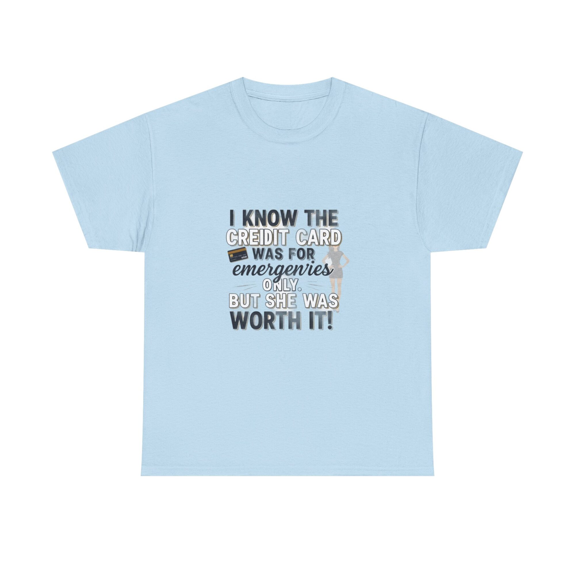 Make a statement with this funny graphic t-shirt featuring the phrase ‘I know the credit card was for emergencies only, but she was worth it!’ Perfect for casual wear or as a unique gift, this premium unisex tee is crafted from soft, breathable fabric and printed with high-quality Printify technology for lasting comfort and style. Ideal for daily outfits or as a humorous gift for friends and loved ones.