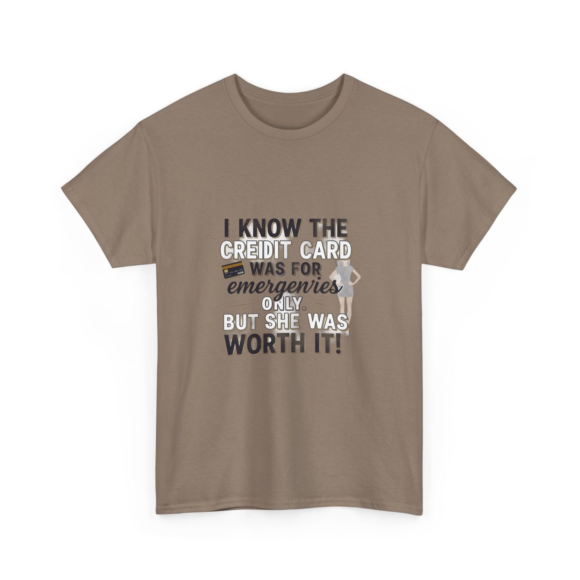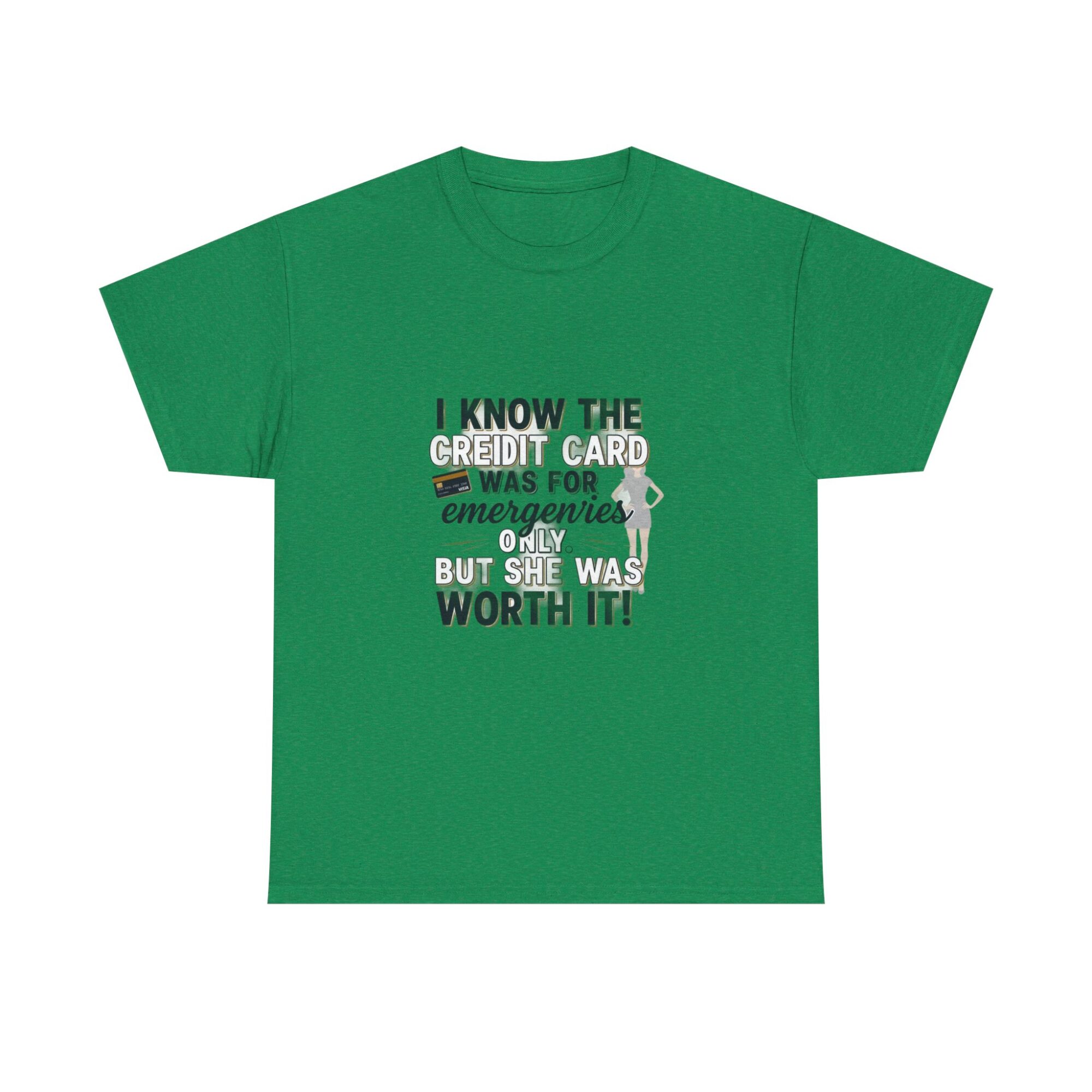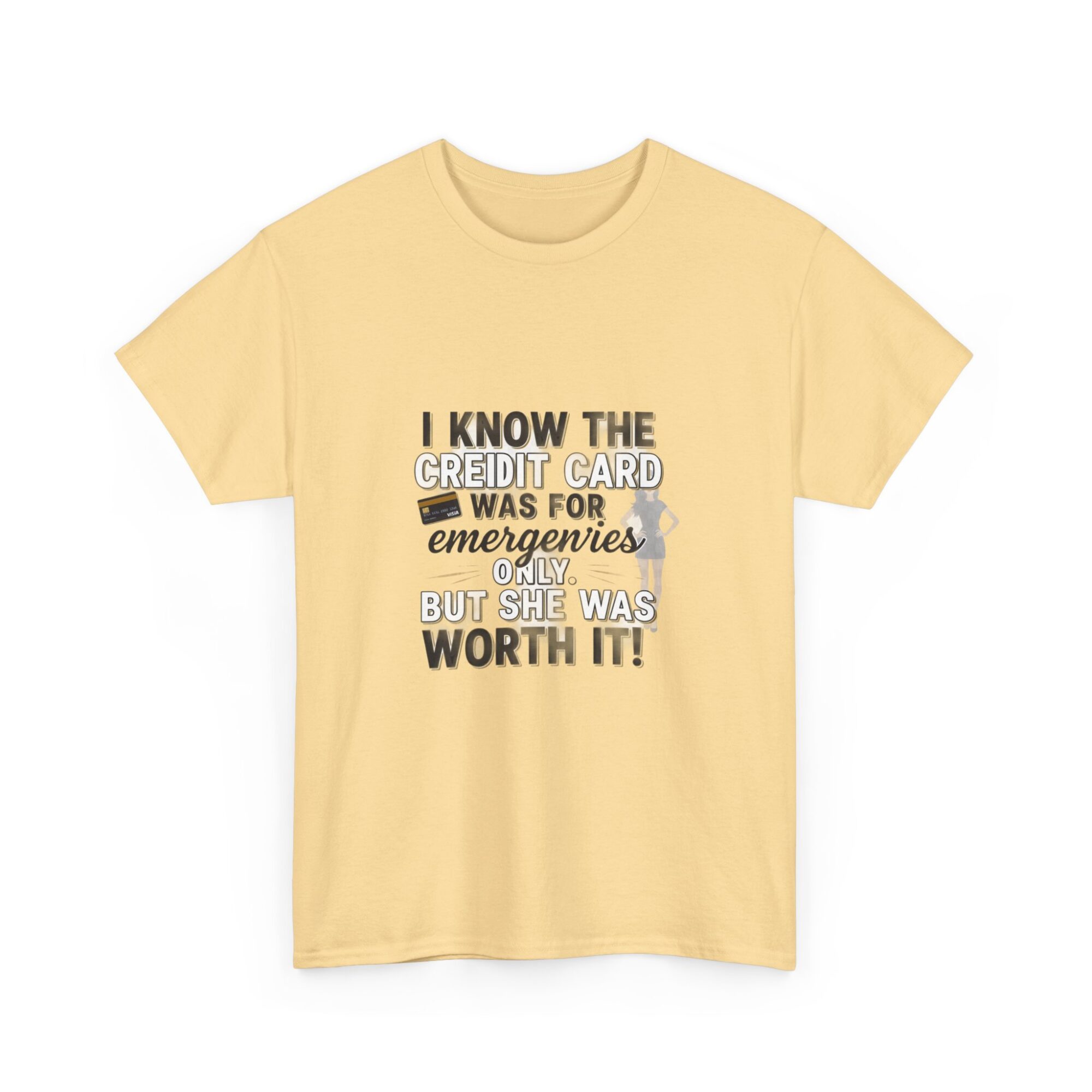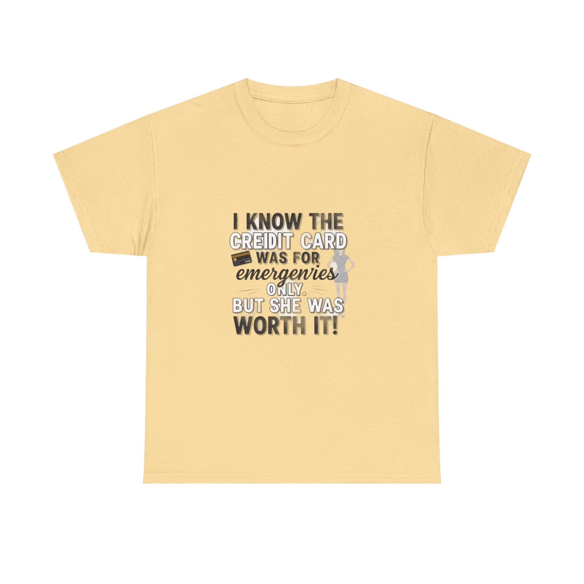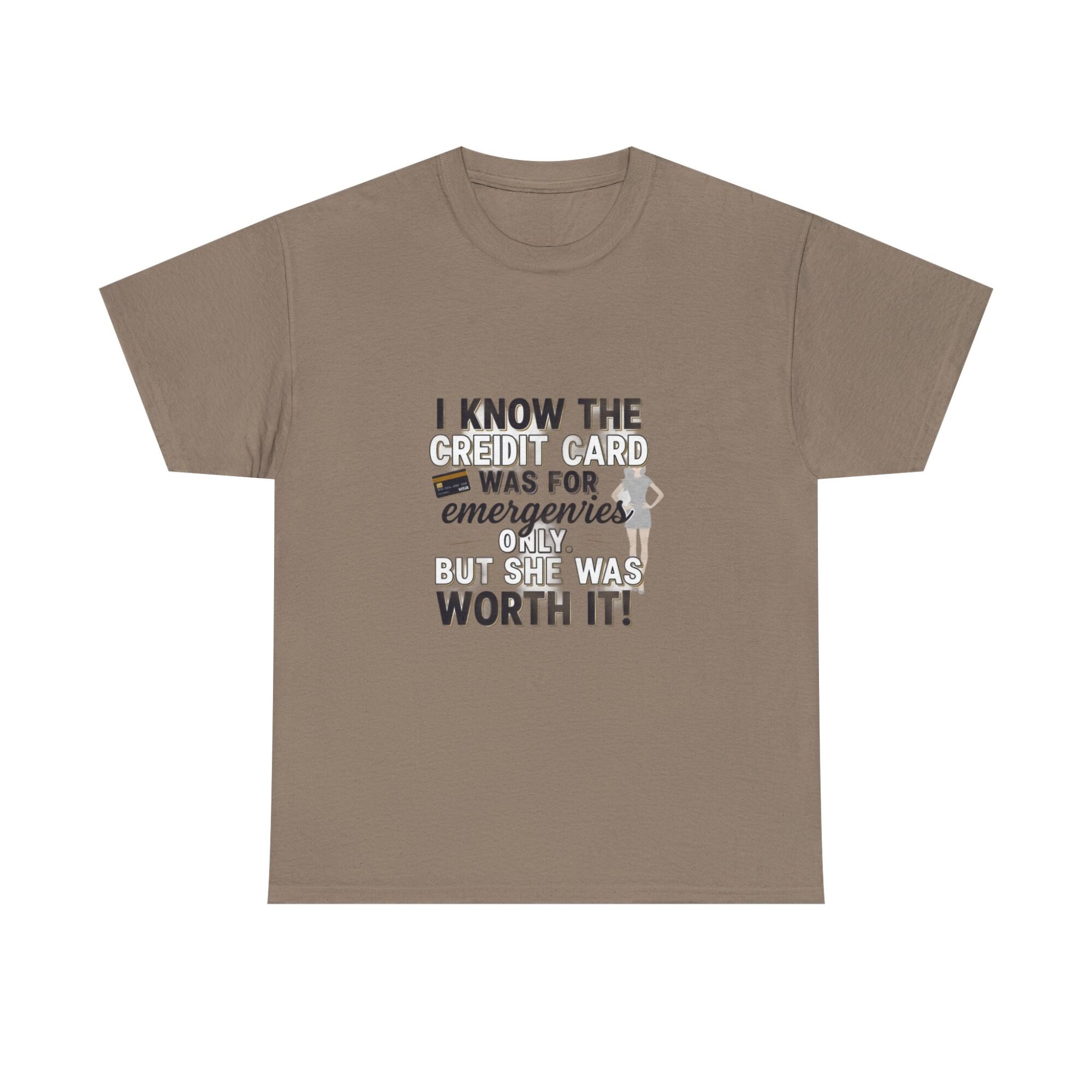 Make a statement with this funny graphic t-shirt featuring the phrase ‘I know the credit card was for emergencies only, but she was worth it!’ Perfect for casual wear or as a unique gift, this premium unisex tee is crafted from soft, breathable fabric and printed with high-quality Printify technology for lasting comfort and style. Ideal for daily outfits or as a humorous gift for friends and loved ones.