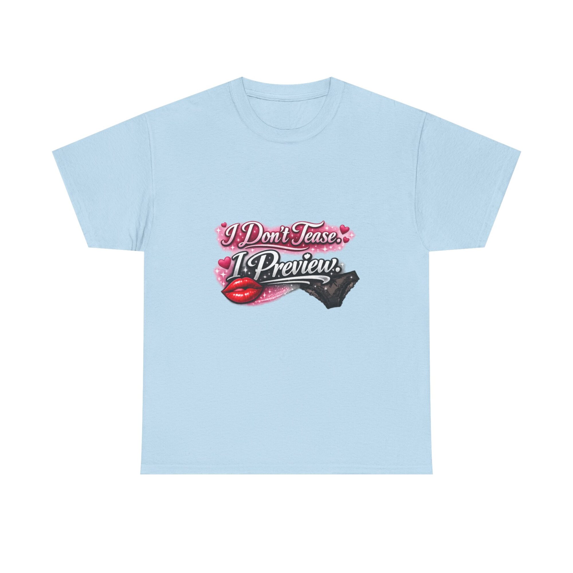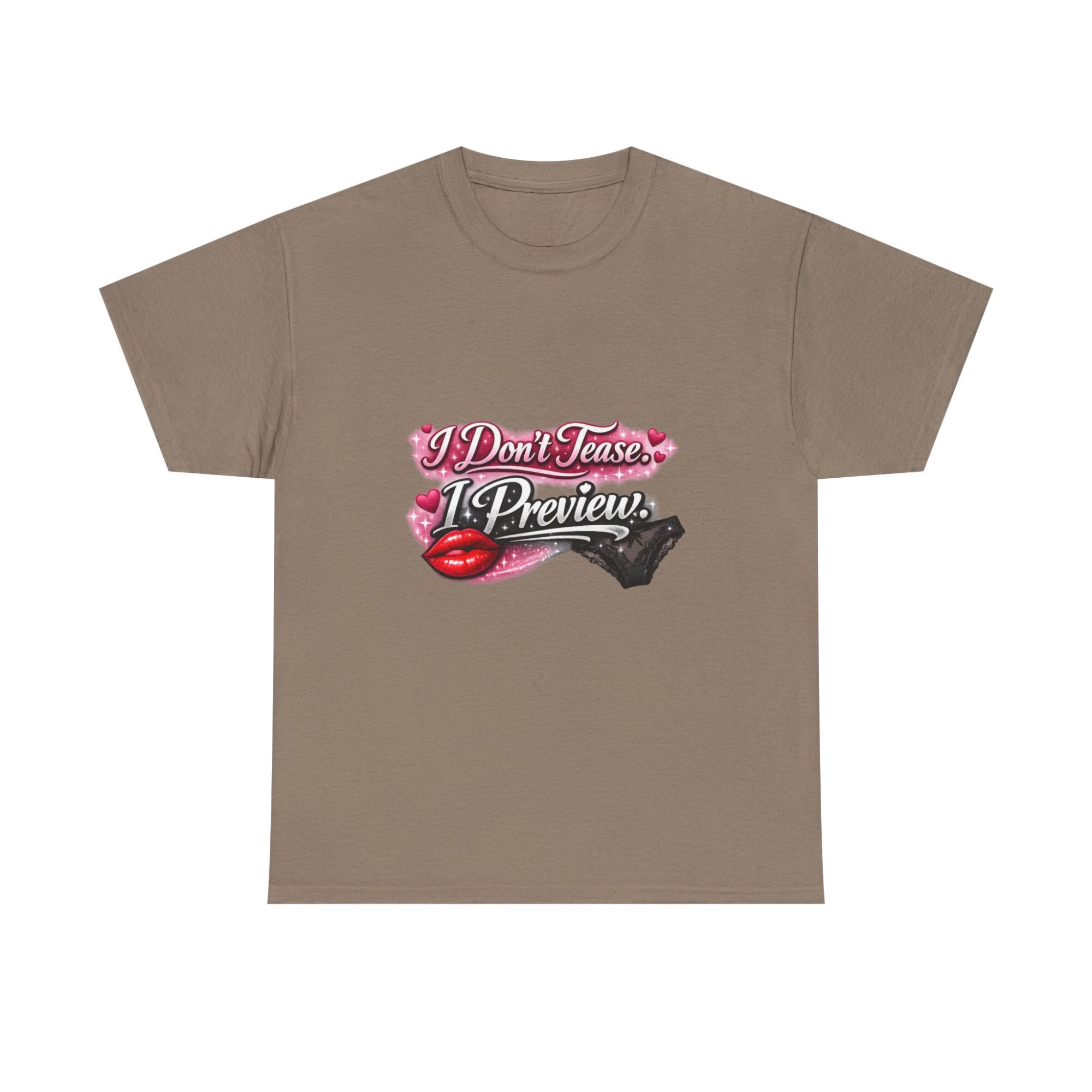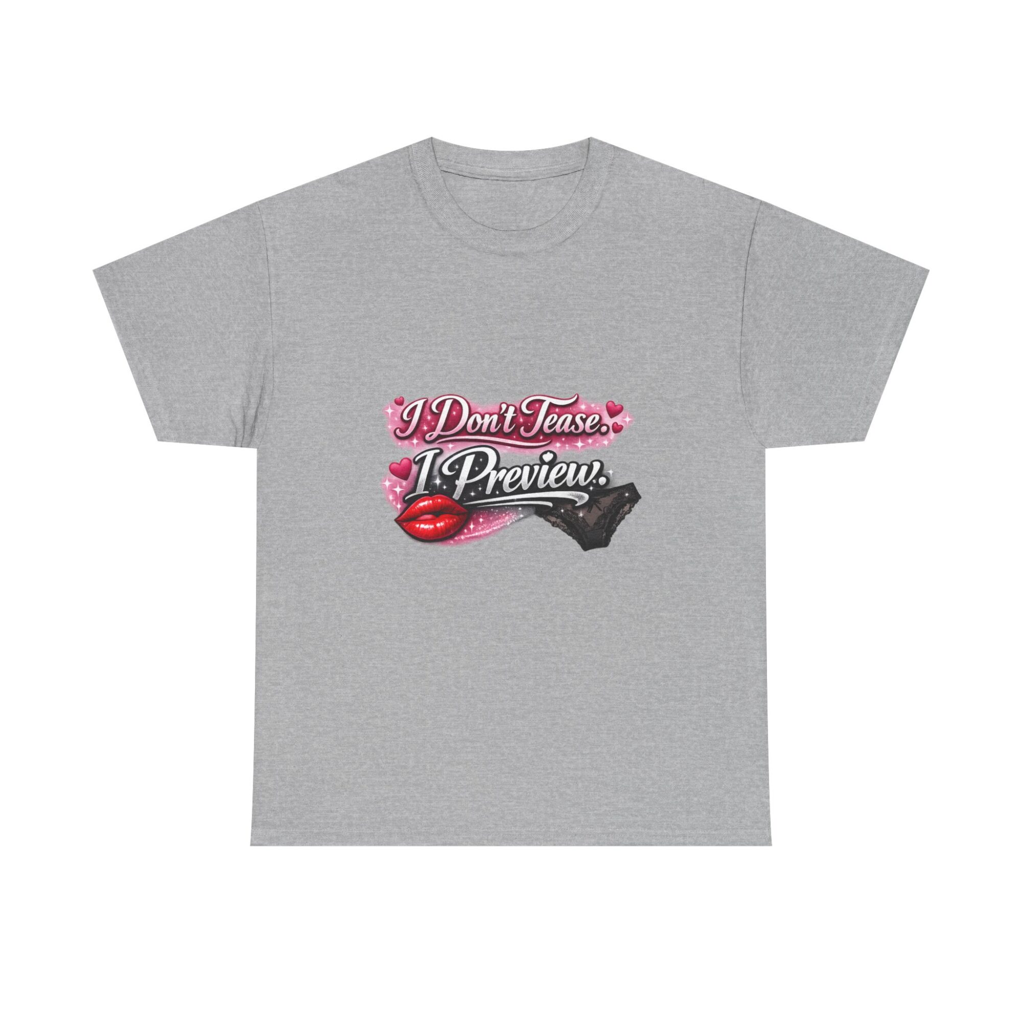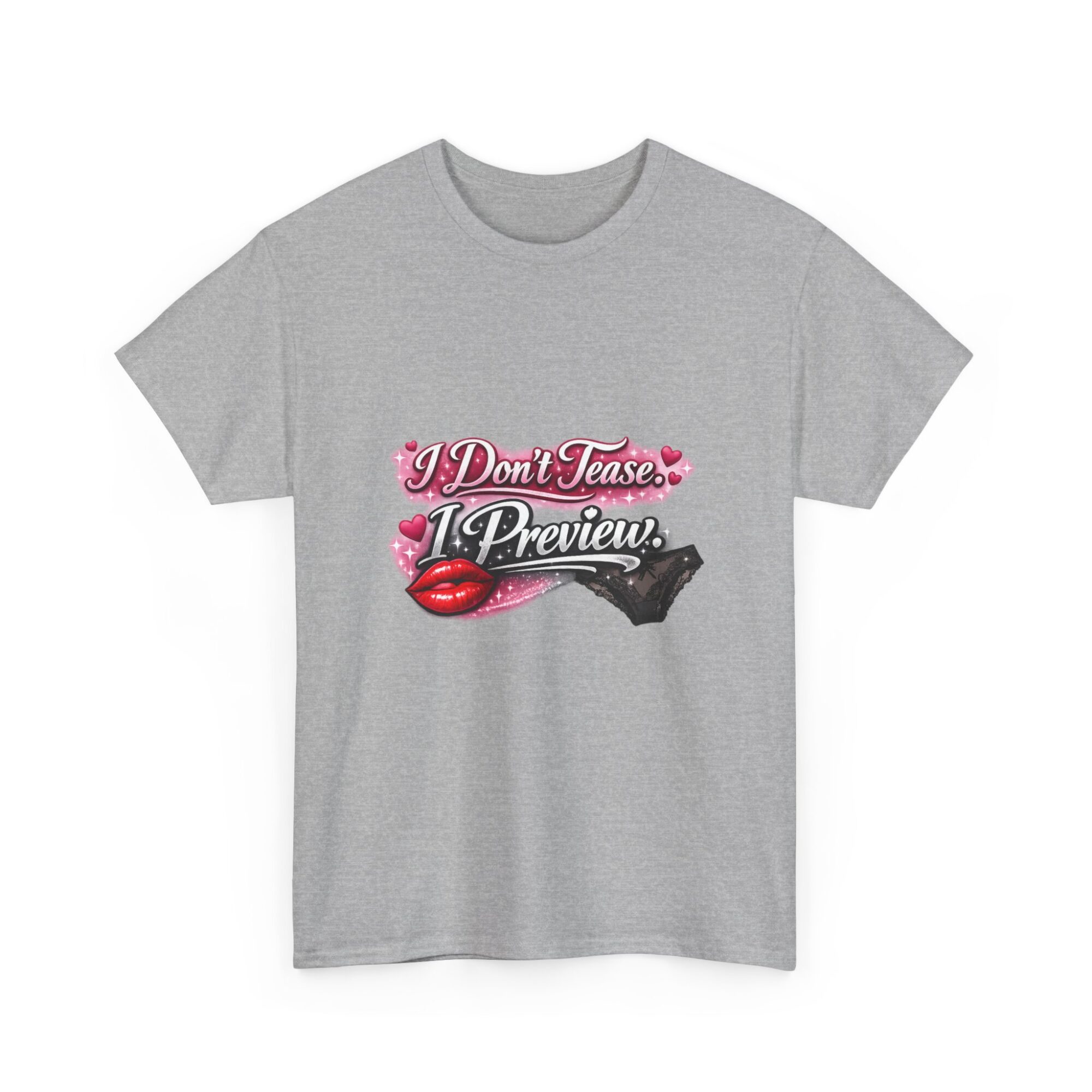 Make a bold statement with our ‘I Don’t Tease, I Preview’ unisex graphic tee. Crafted from soft, breathable fabric, this premium print-on-demand shirt combines comfort and style, perfect for casual outings or gifting. Printed using high-quality technology for vibrant, long-lasting designs. Stand out effortlessly and express your personality with this trendy shirt, ideal for both men and women.