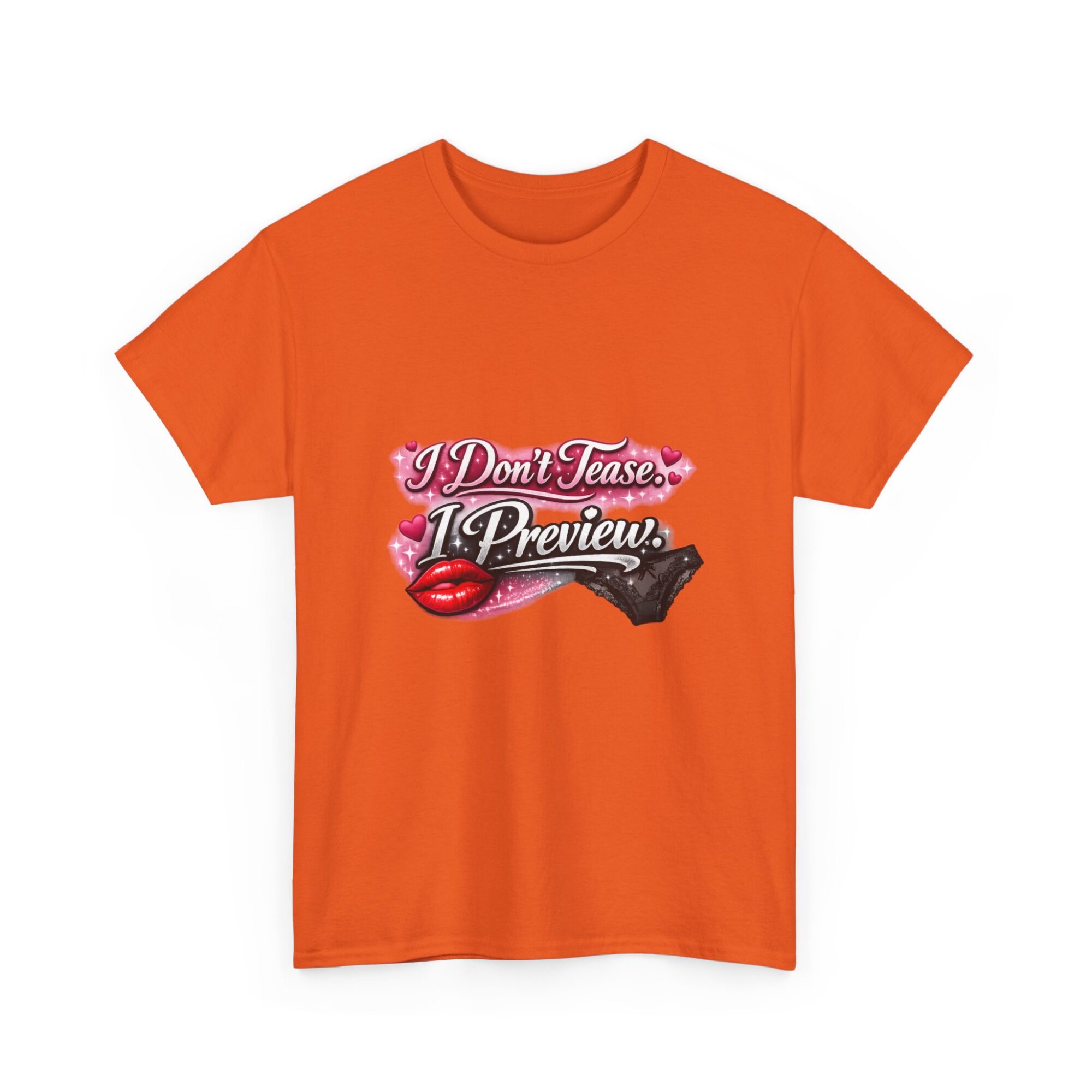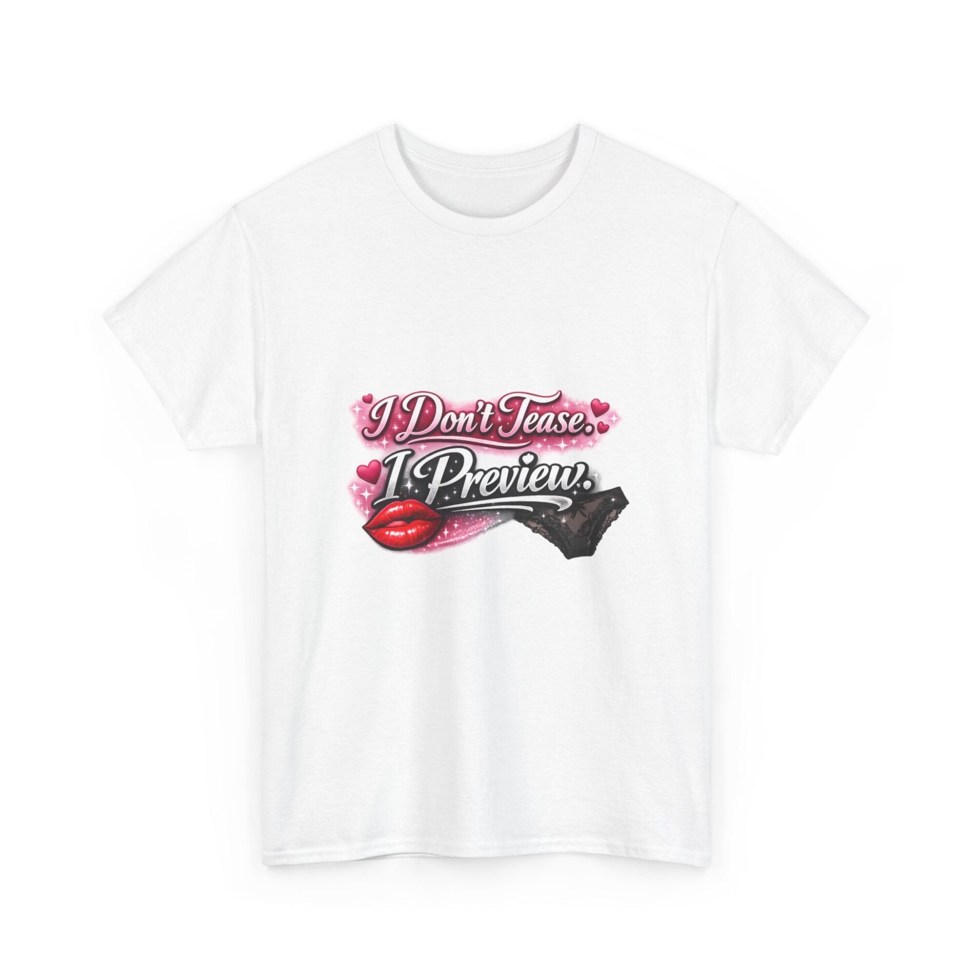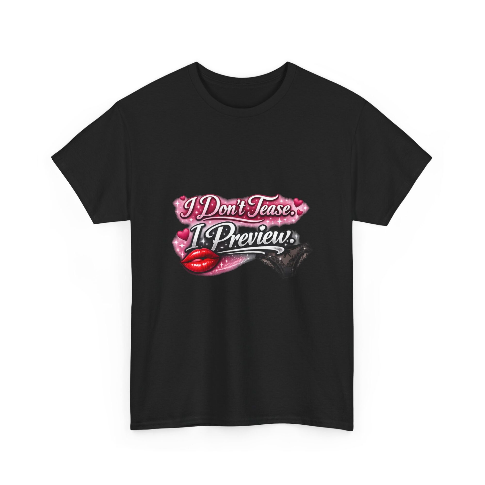 Make a bold statement with our ‘I Don’t Tease, I Preview’ unisex graphic tee. Crafted from soft, breathable fabric, this premium print-on-demand shirt combines comfort and style, perfect for casual outings or gifting. Printed using high-quality technology for vibrant, long-lasting designs. Stand out effortlessly and express your personality with this trendy shirt, ideal for both men and women.