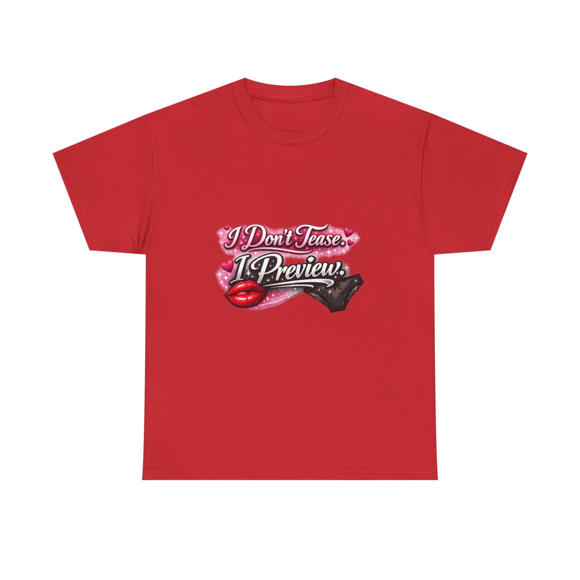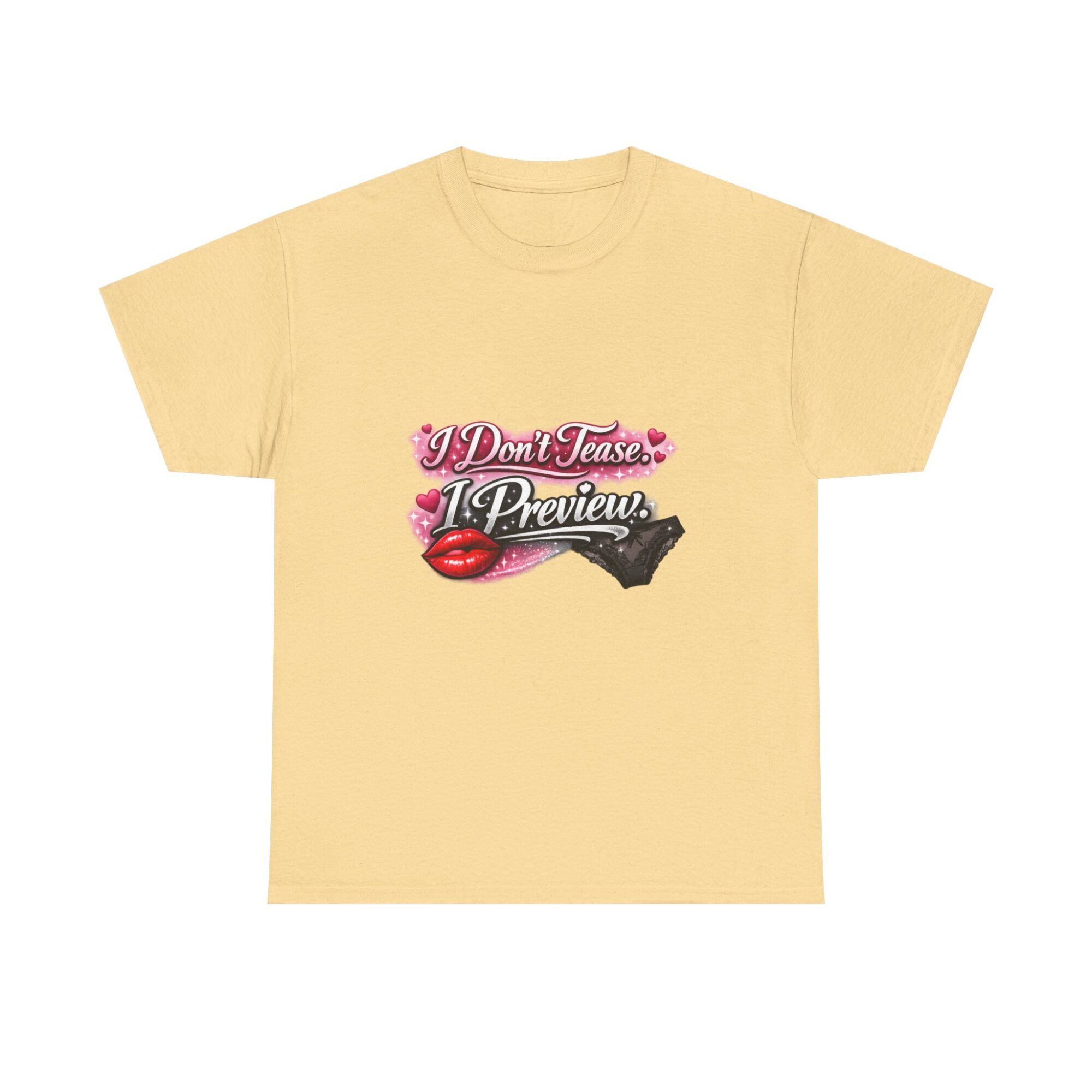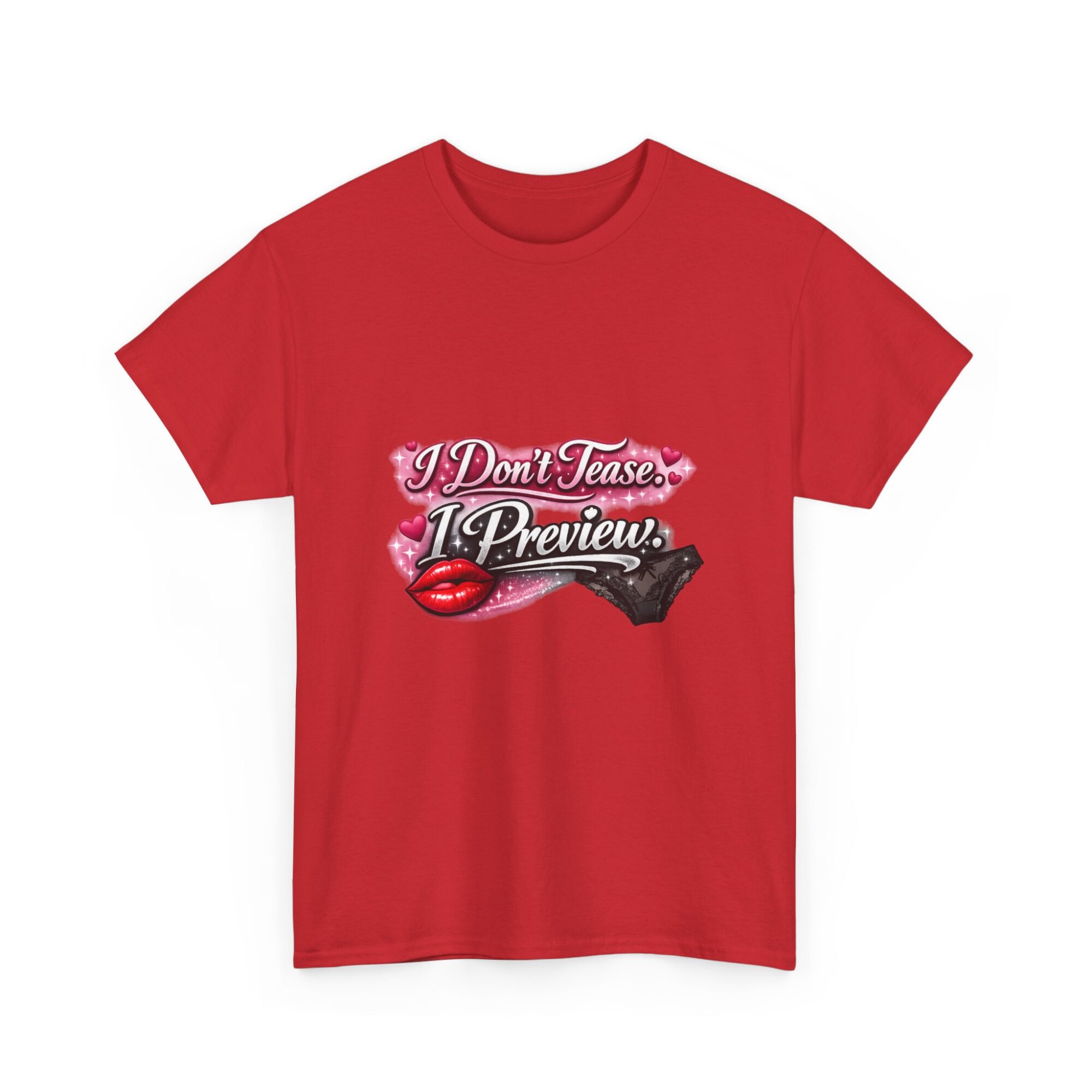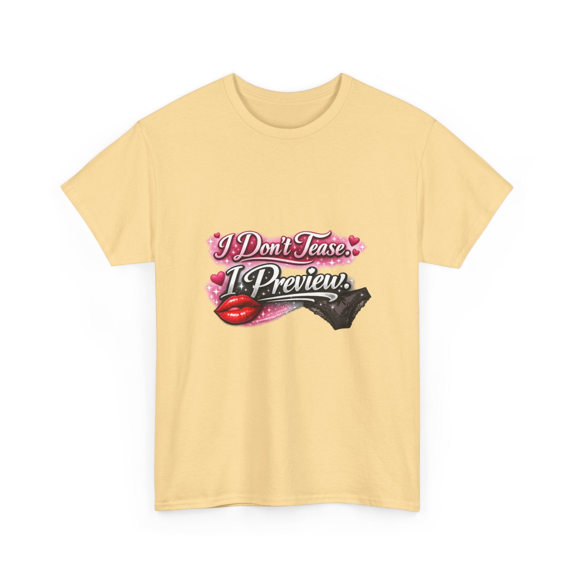 Make a bold statement with our ‘I Don’t Tease, I Preview’ unisex graphic tee. Crafted from soft, breathable fabric, this premium print-on-demand shirt combines comfort and style, perfect for casual outings or gifting. Printed using high-quality technology for vibrant, long-lasting designs. Stand out effortlessly and express your personality with this trendy shirt, ideal for both men and women.