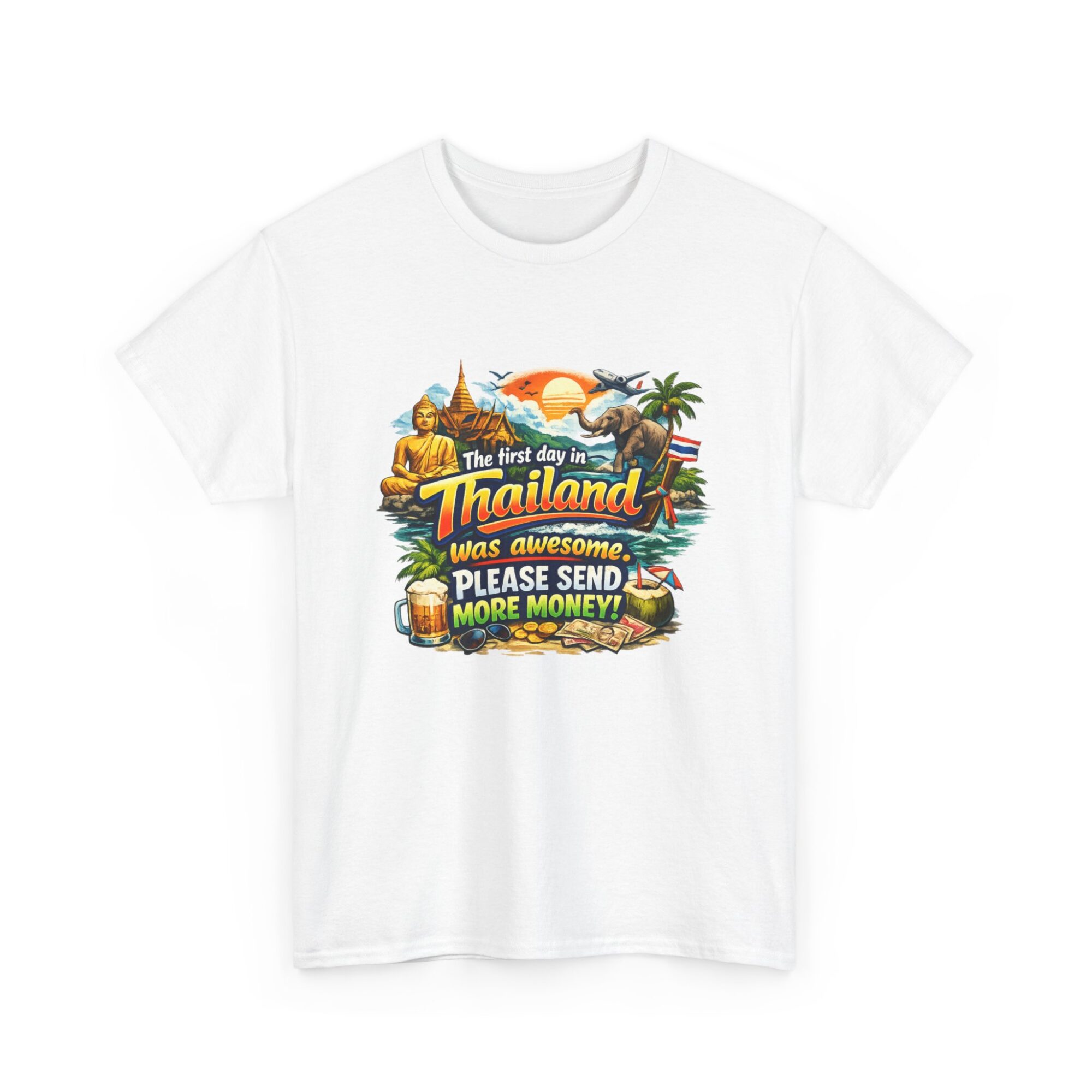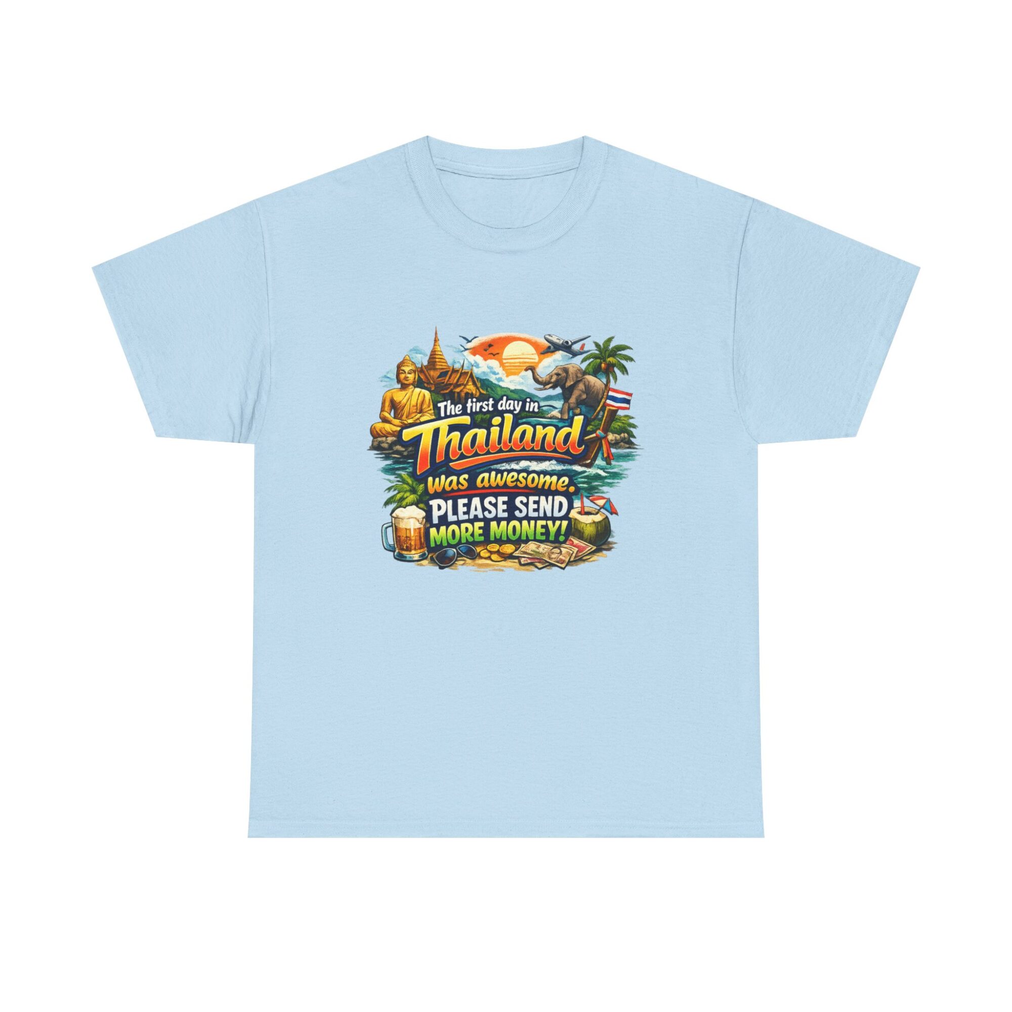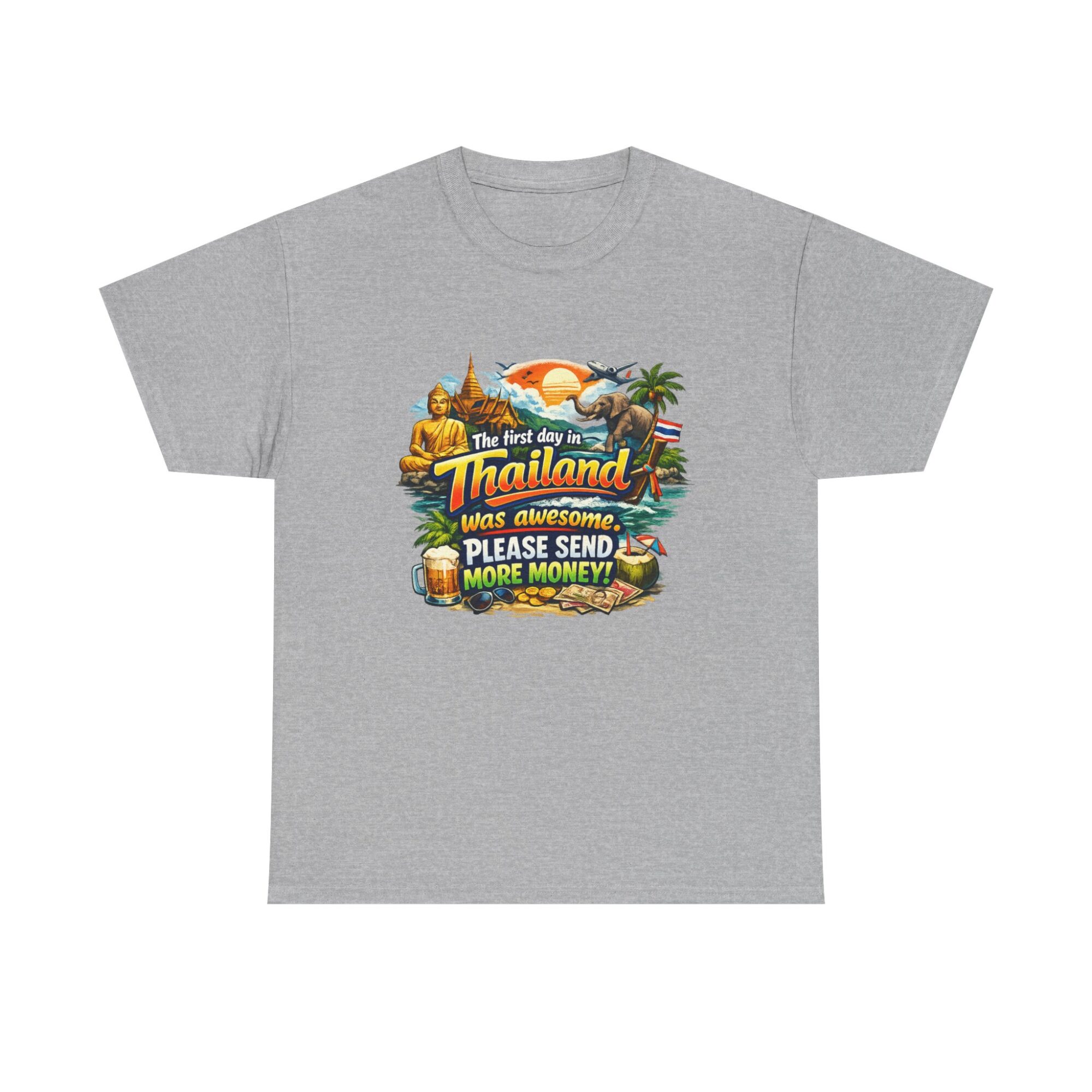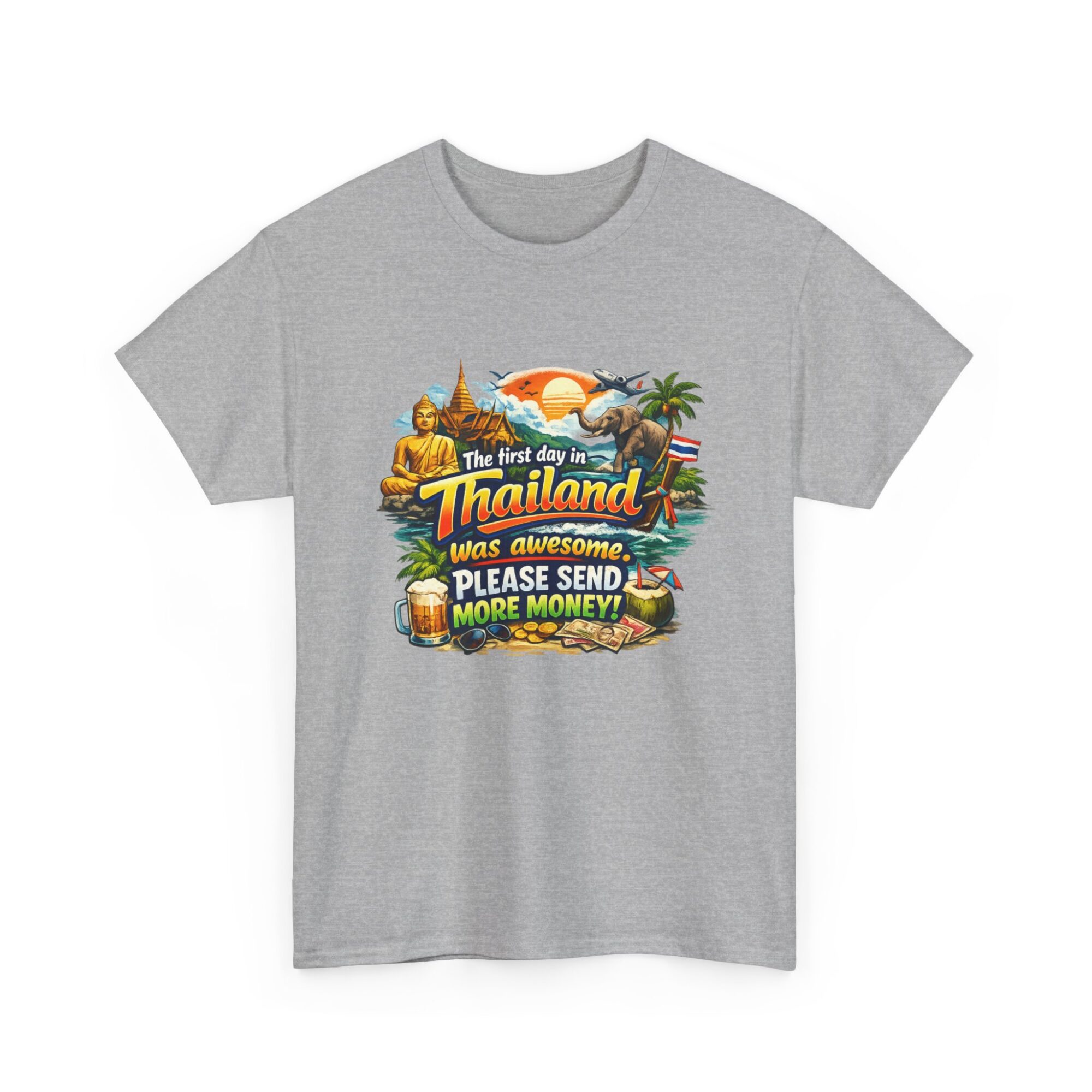 Embrace your wanderlust with our hilarious ‘First Day in Thailand’ graphic tee! Made from soft, breathable fabric, this unisex t-shirt features a vibrant print perfect for casual wear, gifts, or making a statement. Ideal for travel enthusiasts, it’s designed for lasting comfort and style. Gift it to yourself or loved ones who appreciate humor and adventure!
