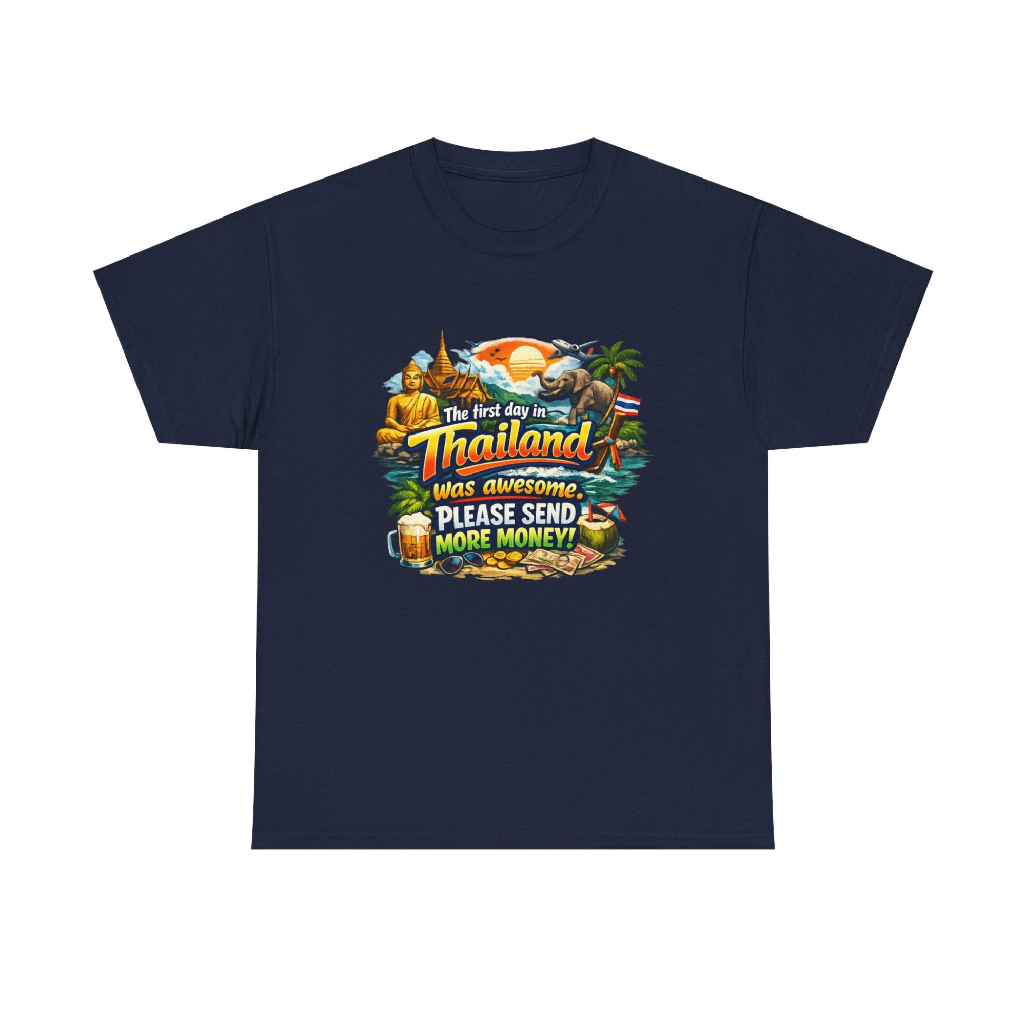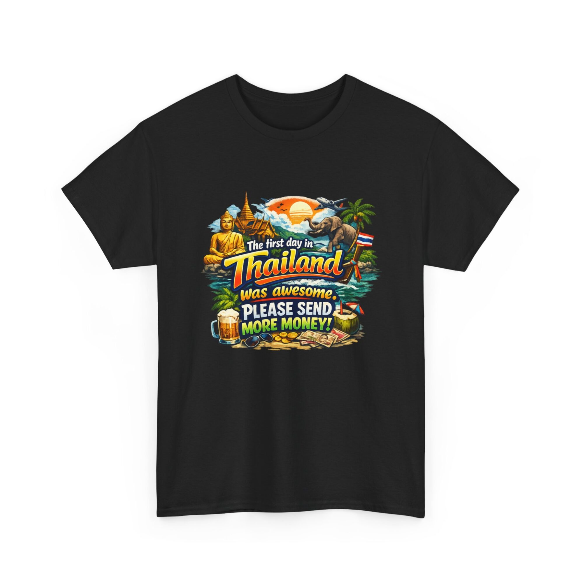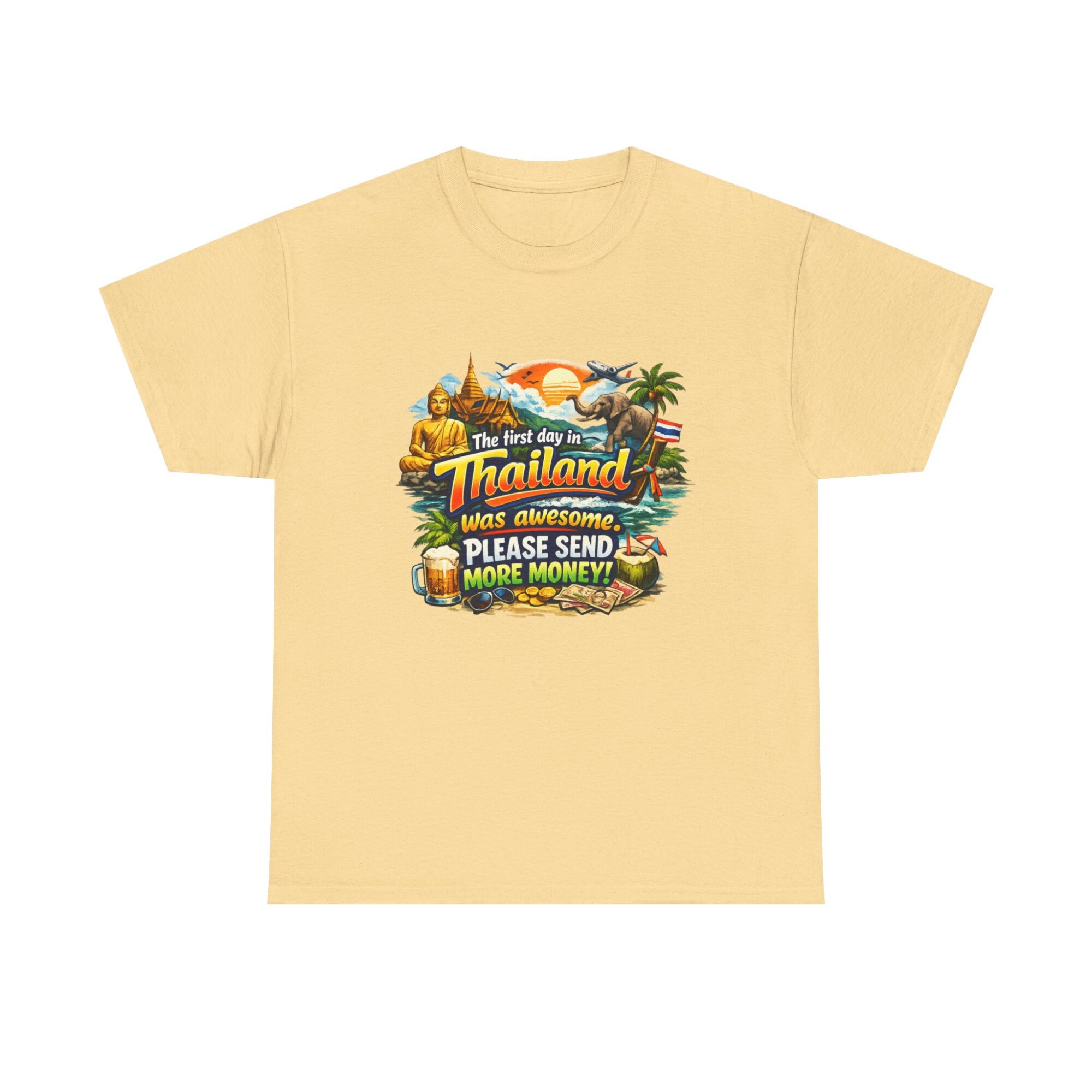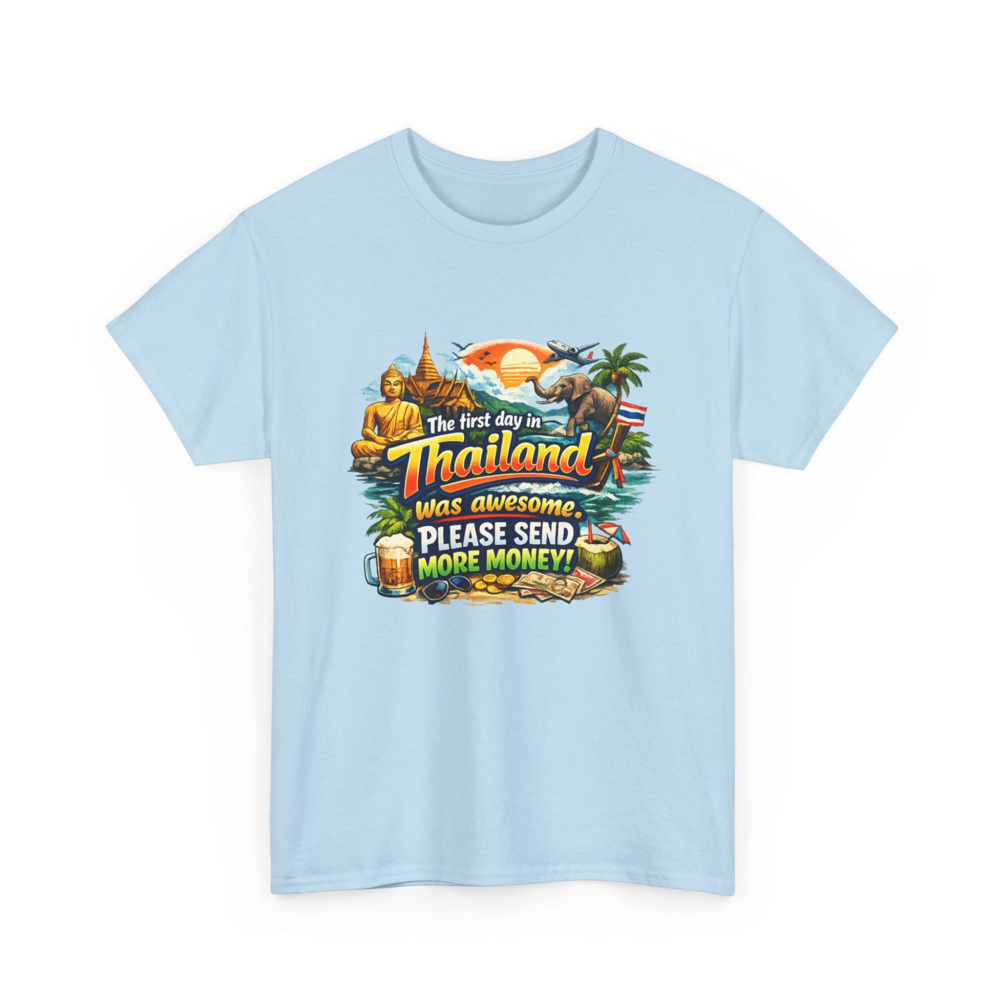 Embrace your wanderlust with our hilarious ‘First Day in Thailand’ graphic tee! Made from soft, breathable fabric, this unisex t-shirt features a vibrant print perfect for casual wear, gifts, or making a statement. Ideal for travel enthusiasts, it’s designed for lasting comfort and style. Gift it to yourself or loved ones who appreciate humor and adventure!