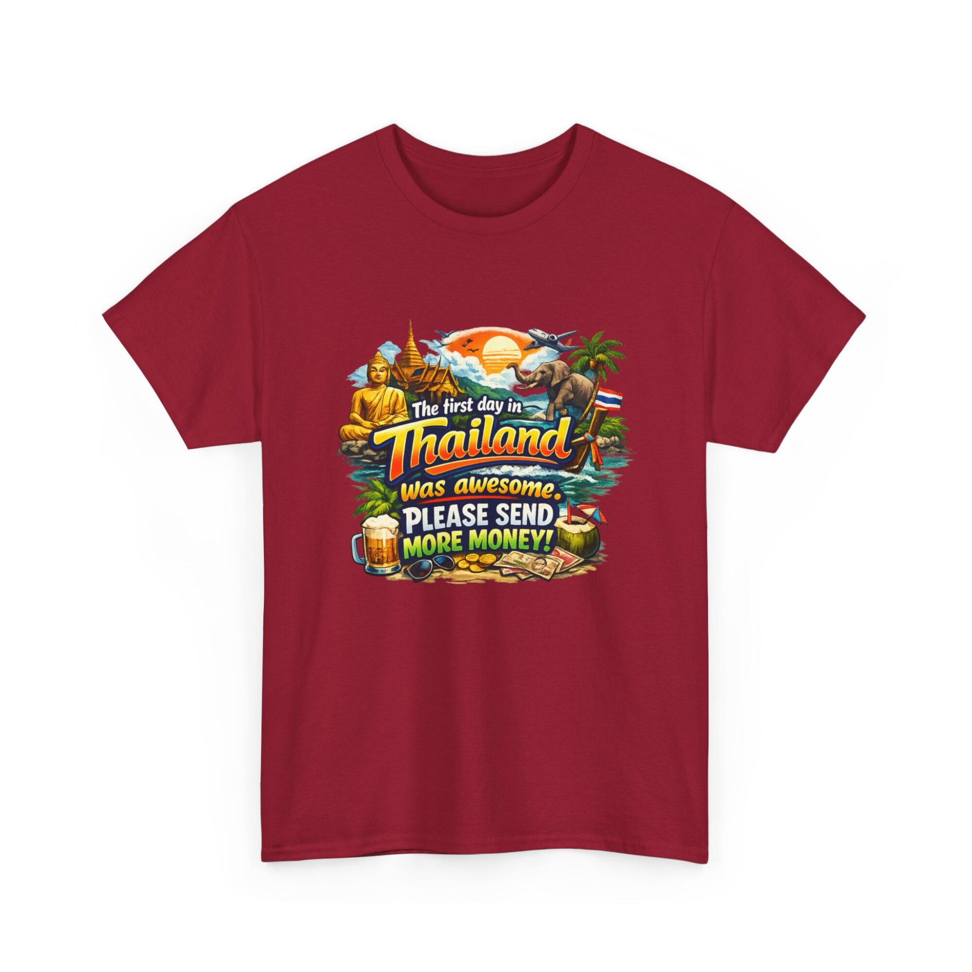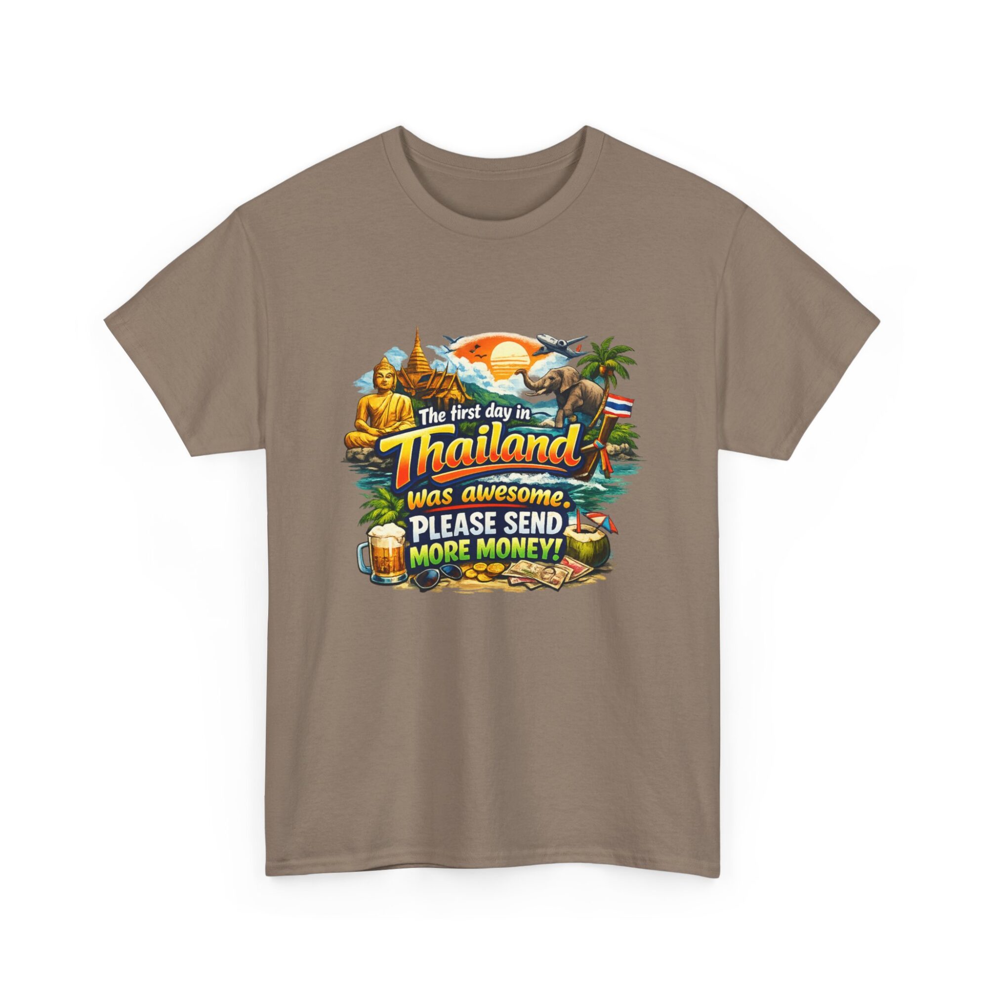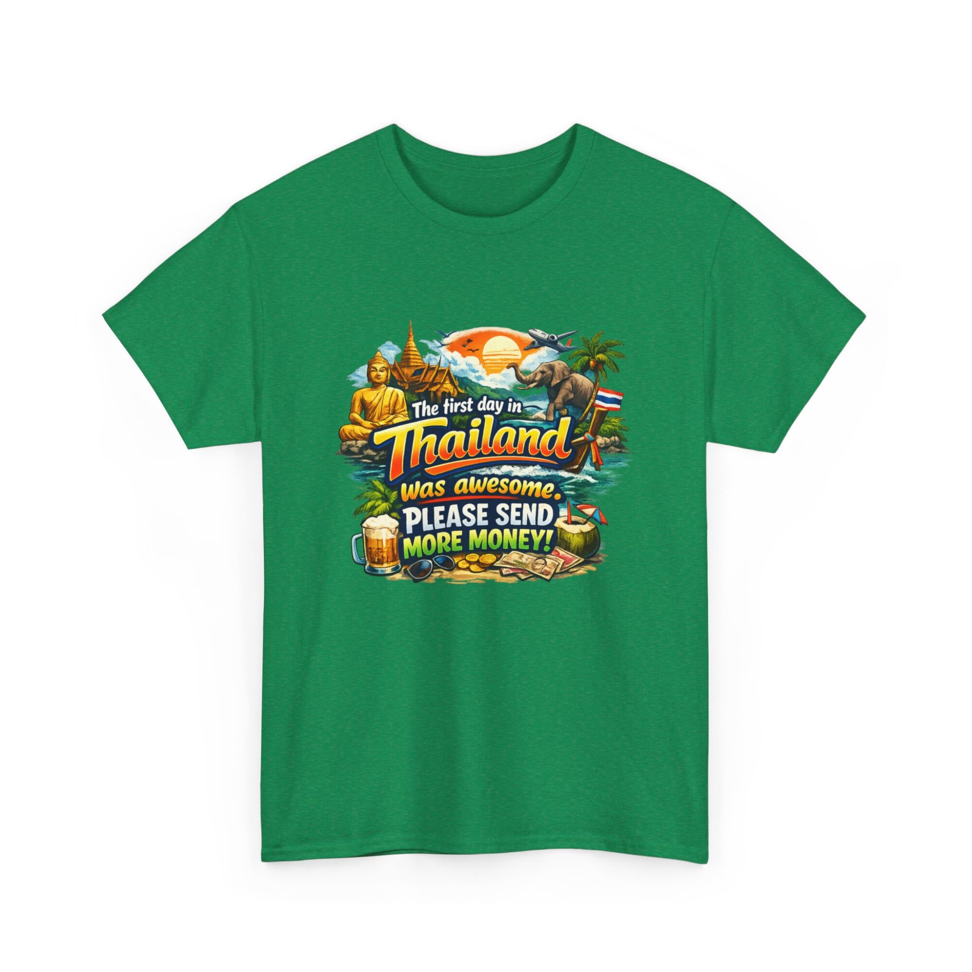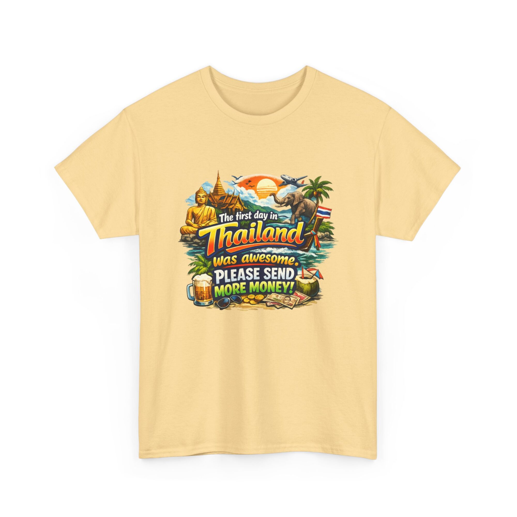 Embrace your wanderlust with our hilarious ‘First Day in Thailand’ graphic tee! Made from soft, breathable fabric, this unisex t-shirt features a vibrant print perfect for casual wear, gifts, or making a statement. Ideal for travel enthusiasts, it’s designed for lasting comfort and style. Gift it to yourself or loved ones who appreciate humor and adventure!