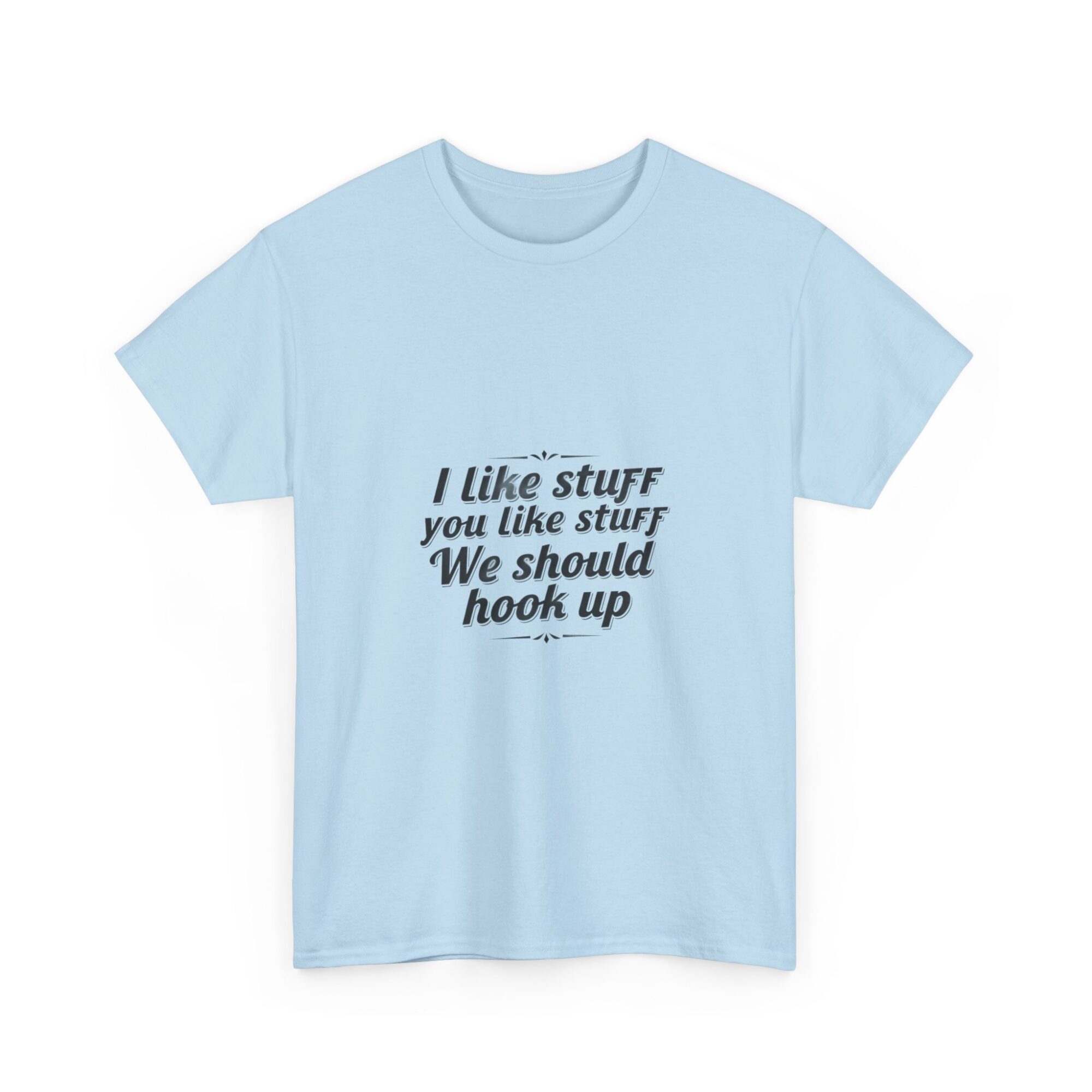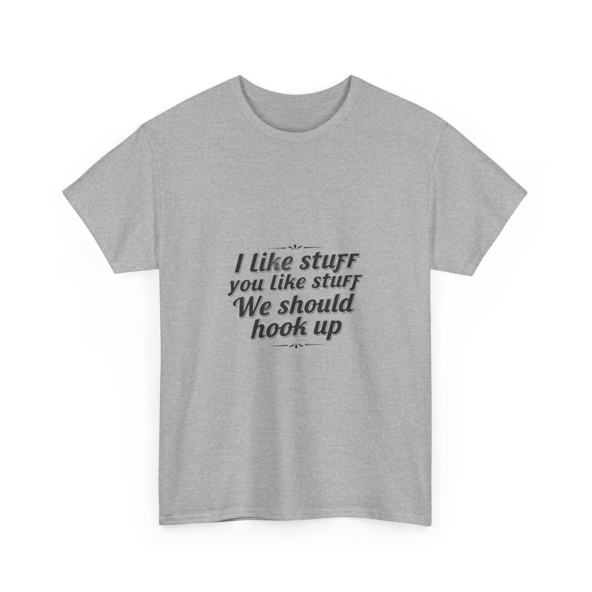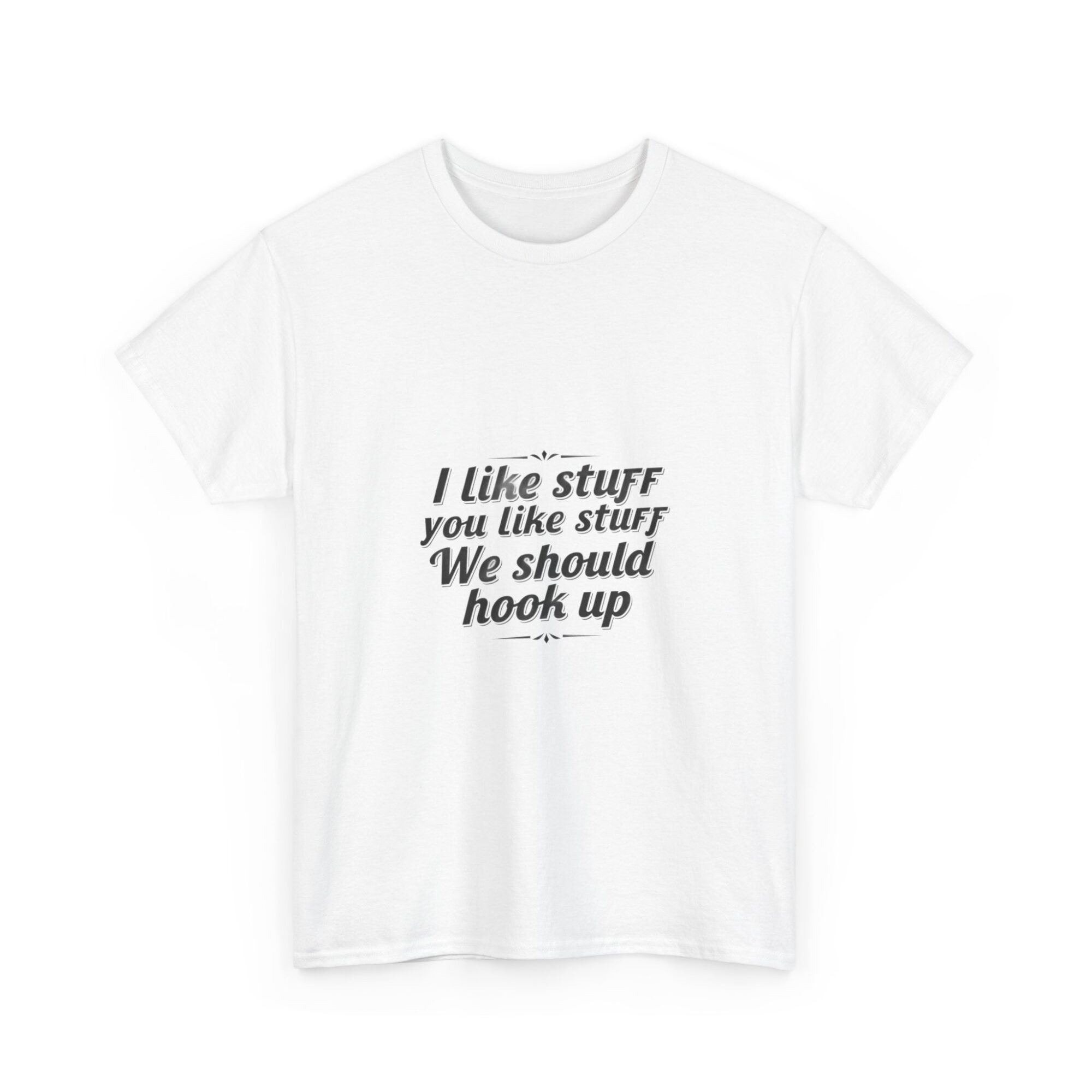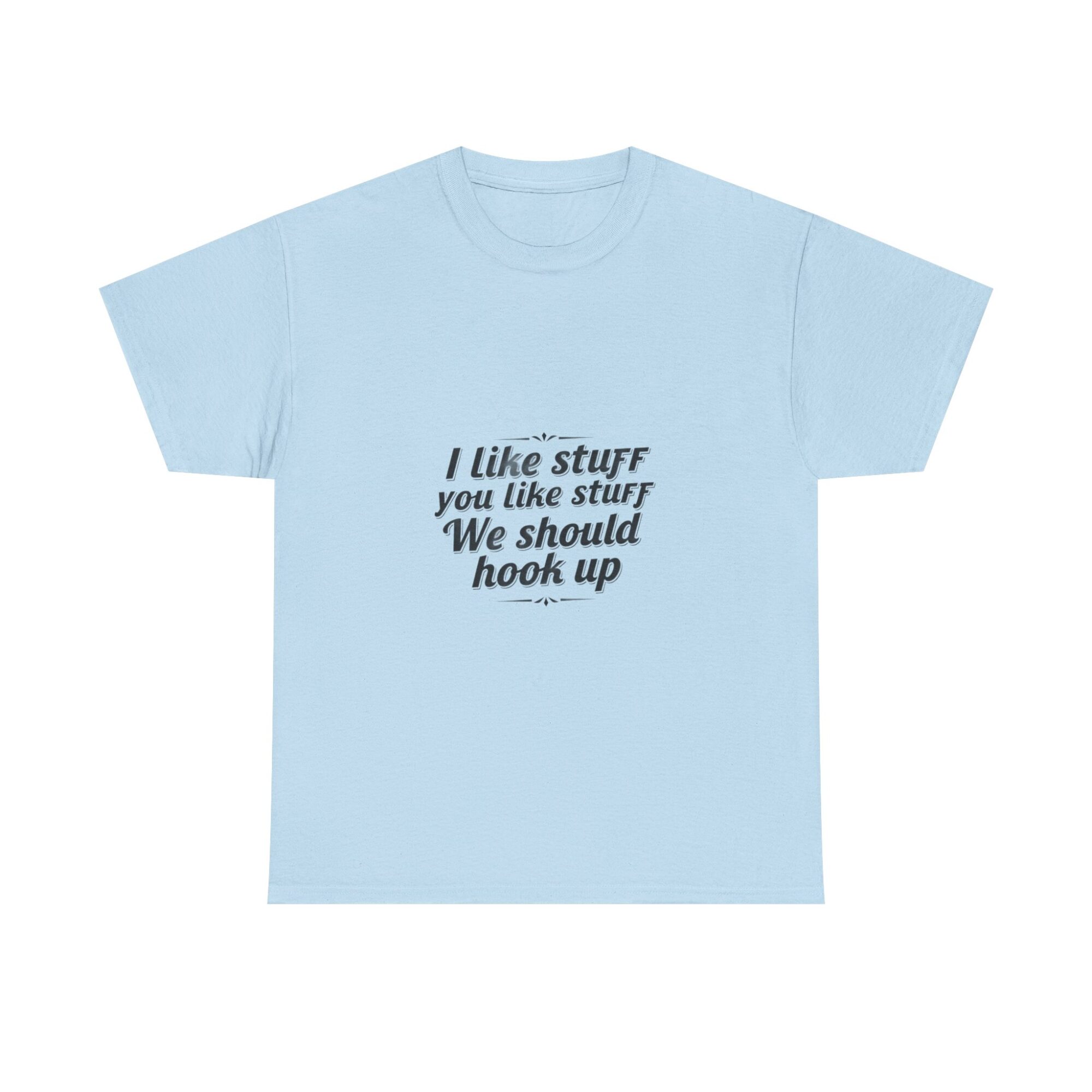Elevate your casual wardrobe with our premium unisex graphic tee featuring the fun message, ‘I like stuff you like stuff, We should hook up.’ Crafted from soft, breathable fabric, this shirt is perfect for everyday wear, gifts, or making a statement with ease. Utilizing professional Printify direct-to-garment technology, it ensures crisp, long-lasting prints. Ideal for anyone looking to express personality while staying comfortable.