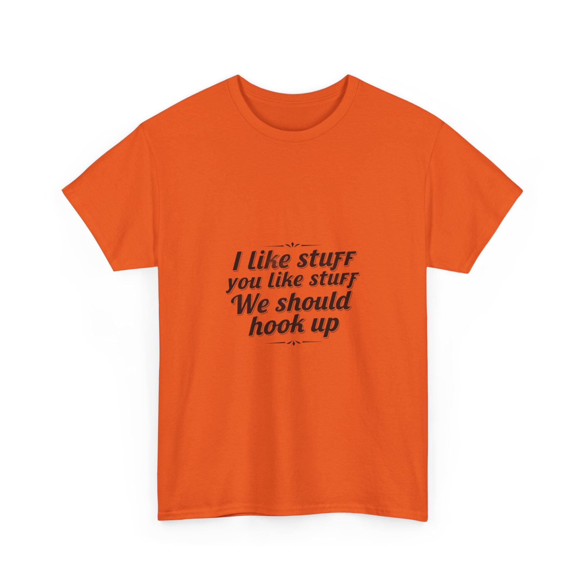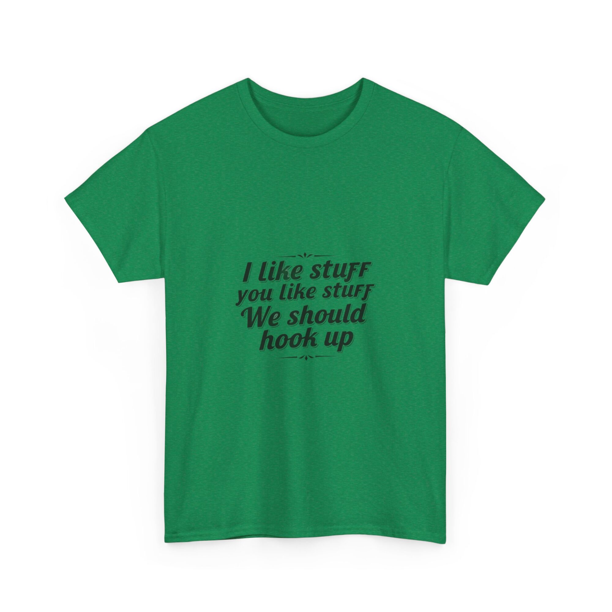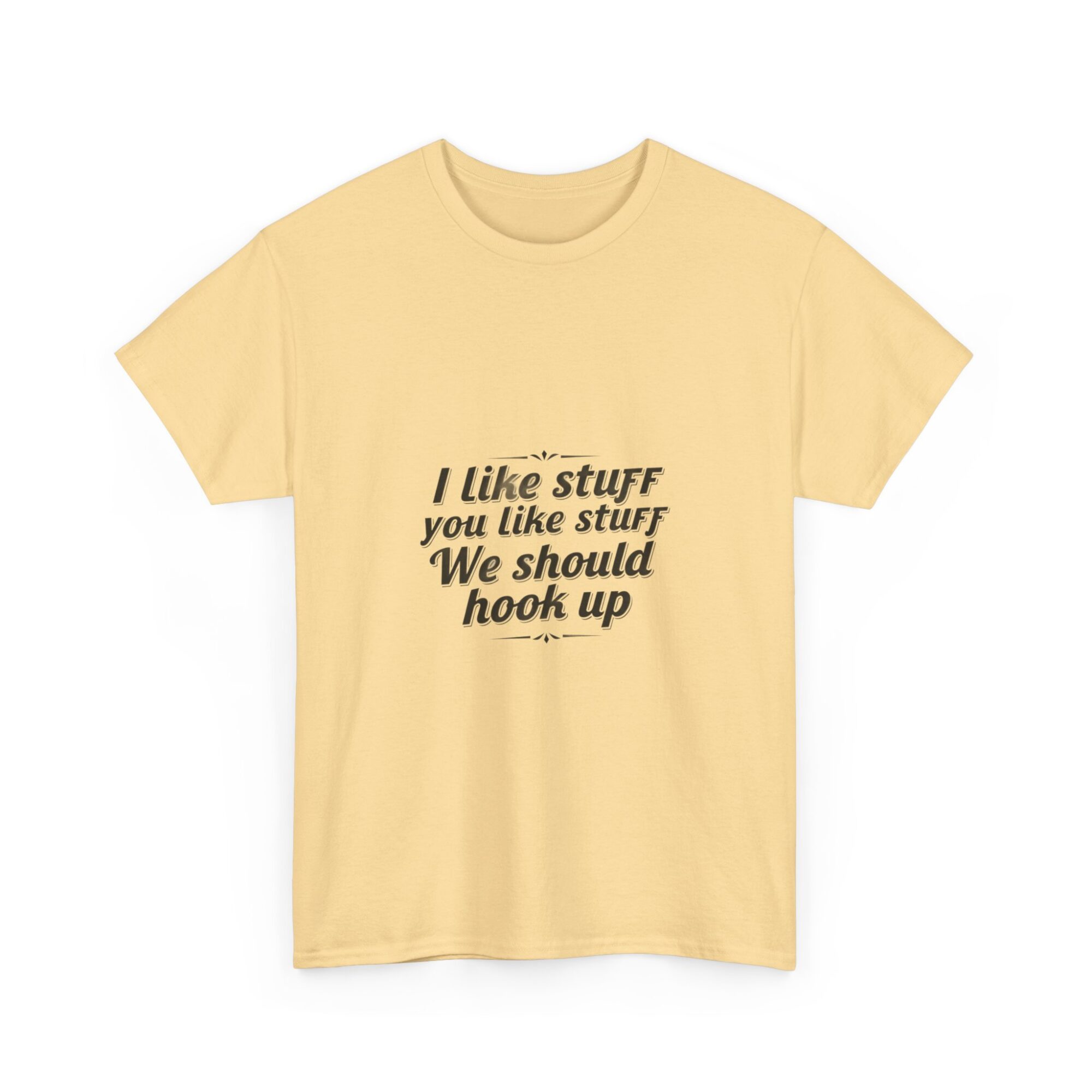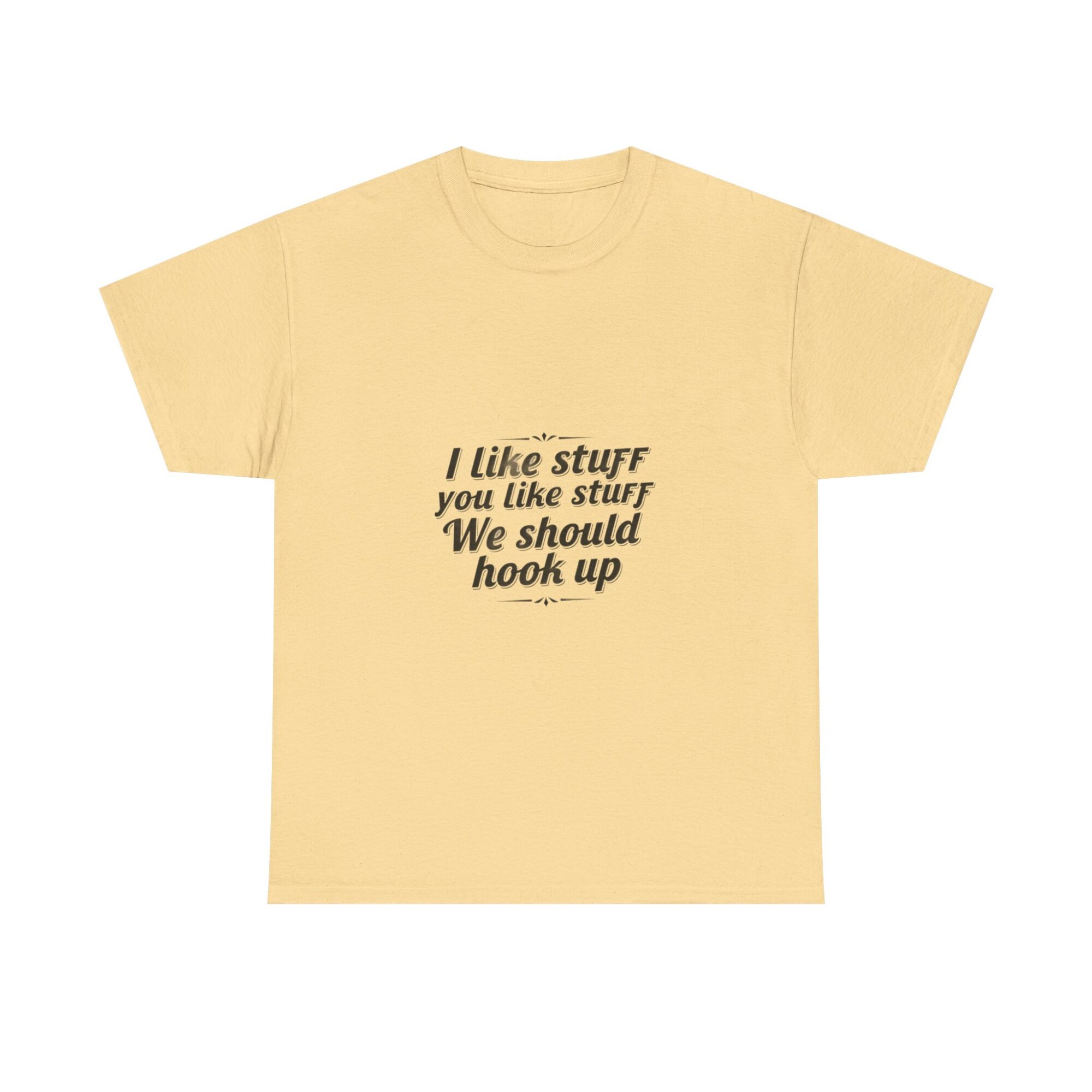 Elevate your casual wardrobe with our premium unisex graphic tee featuring the fun message, ‘I like stuff you like stuff, We should hook up.’ Crafted from soft, breathable fabric, this shirt is perfect for everyday wear, gifts, or making a statement with ease. Utilizing professional Printify direct-to-garment technology, it ensures crisp, long-lasting prints. Ideal for anyone looking to express personality while staying comfortable.